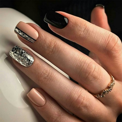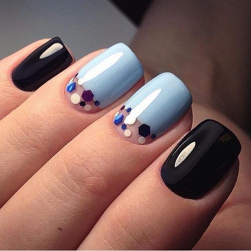 - Manicure with camoufuki. Brilliant confetti or camouflage - a simple replacement for sparkles and rhinestones, but no less beautiful. Any shine shine is well suited to the black base, but requires a glossy top.