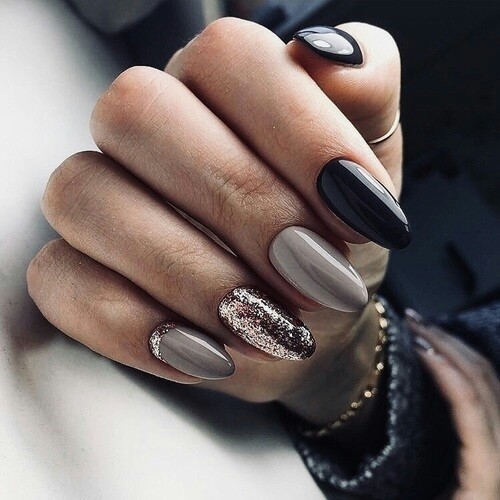 - Beige manicure. A calmer version. Despite the black lacquer, this manicure is calm and feminine. The combination of various textures - sand and gloss, a opaque background and mirror drops effectively looks. Beige varnish can cover all the nails and add a little black monograms.