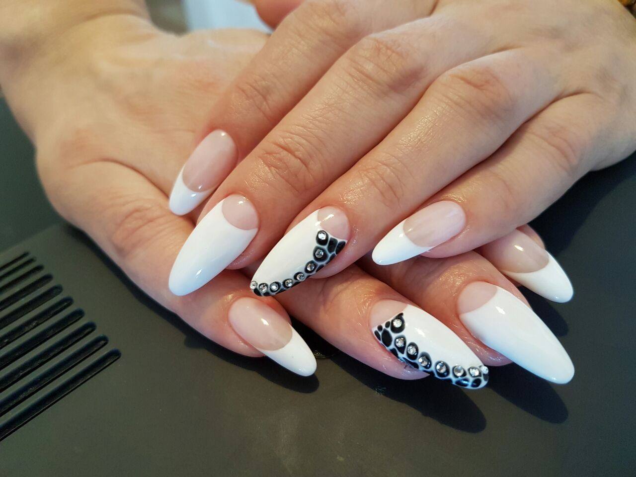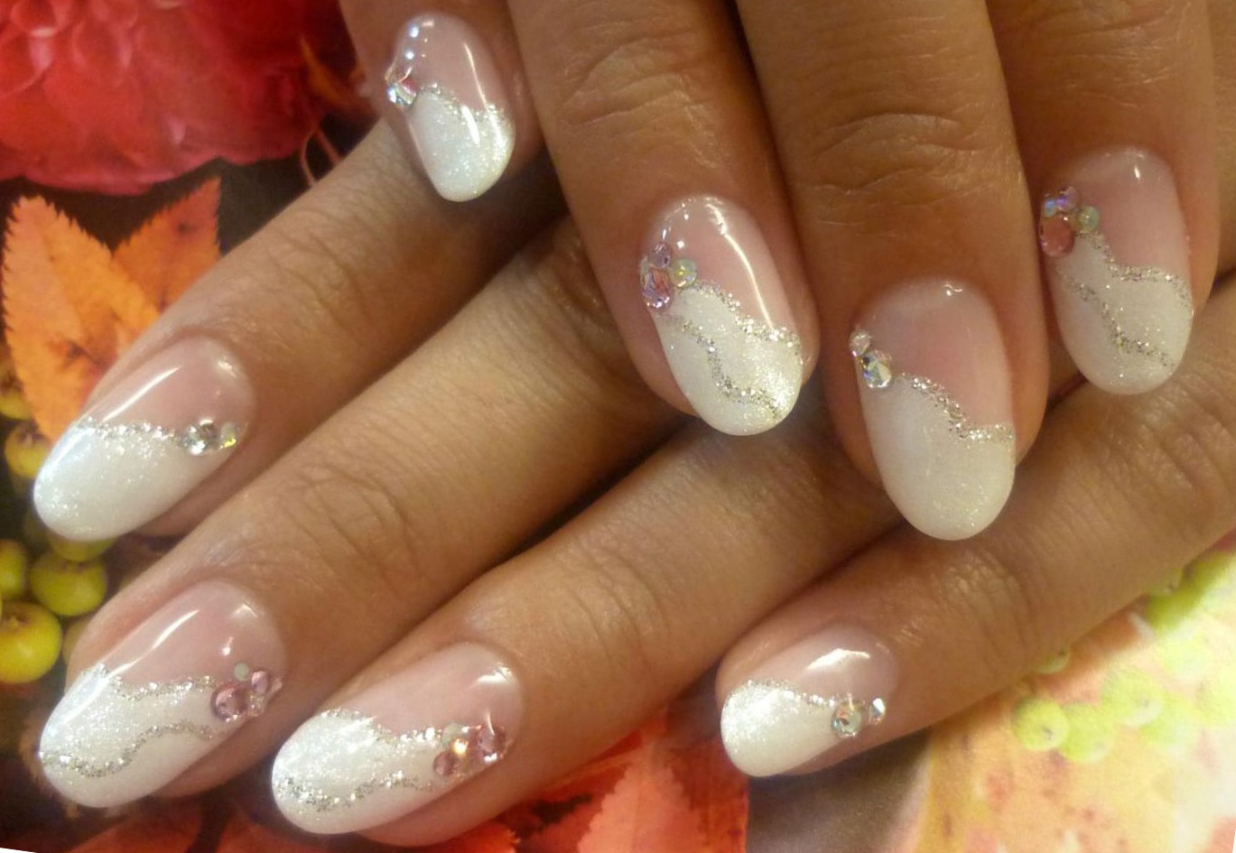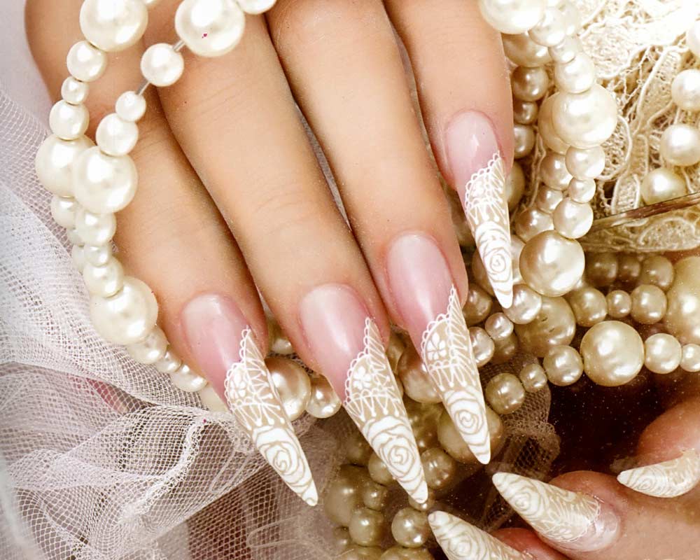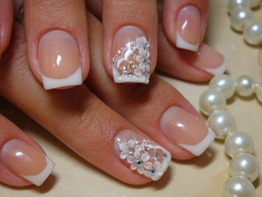 French on the form of "stiletto" with elements of stucco looks gentle, perfect as a wedding manicure.