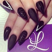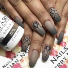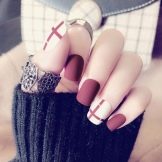The elongated shape of the nails is a real gift for a woman. Extended nails are no less spectacular, sometimes they cannot be distinguished from natural ones. On the extended nails can embody the wildest fantasies. For example, matte tips are well combined with ornaments made with gloss varnishes with a brush or dots.