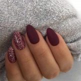 The maximum advantageous velvet coating looks on the nails of a classic oval shape. As for the color, it is preferable to choose rich deep shades. In combination with nude makeup, such a manicure will create a stunning image.