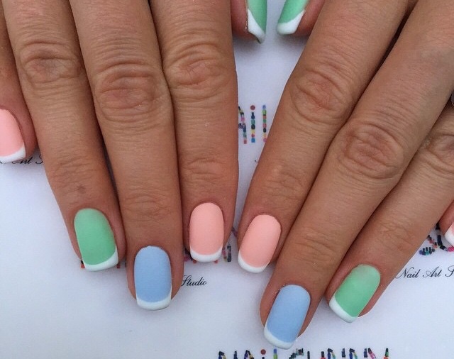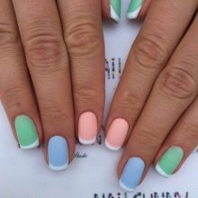 Universal option suitable for nails of any length - French manicure or French. Matte coating on short nails will look more spectacular if you add glossy inserts and elements (a triangle or a hole). On long nails, you can give free rein to your imagination - any variations of the service jacket are relevant here, from classic to fan-french.