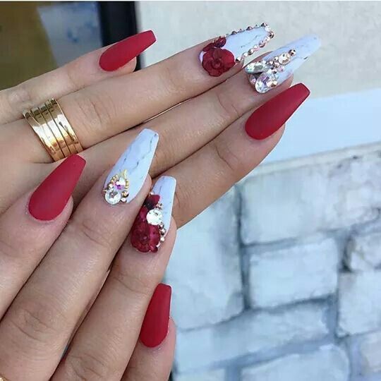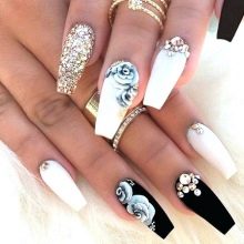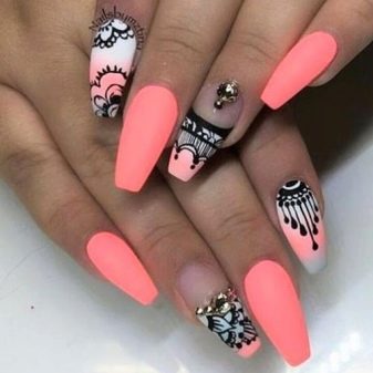 Beauties with a romantic character often choose lace and floral patterns, hearts as decorations. Refinement and elegance of the image can emphasize the strips of gold or silver foil or sparkles. Often accrued matte nails shine with rhinestones and stones, abstract ornaments and sparkles.