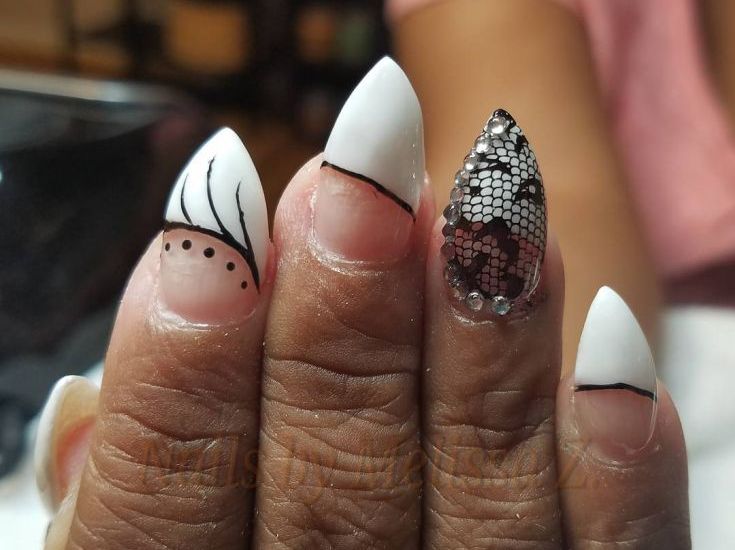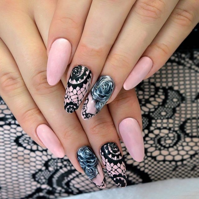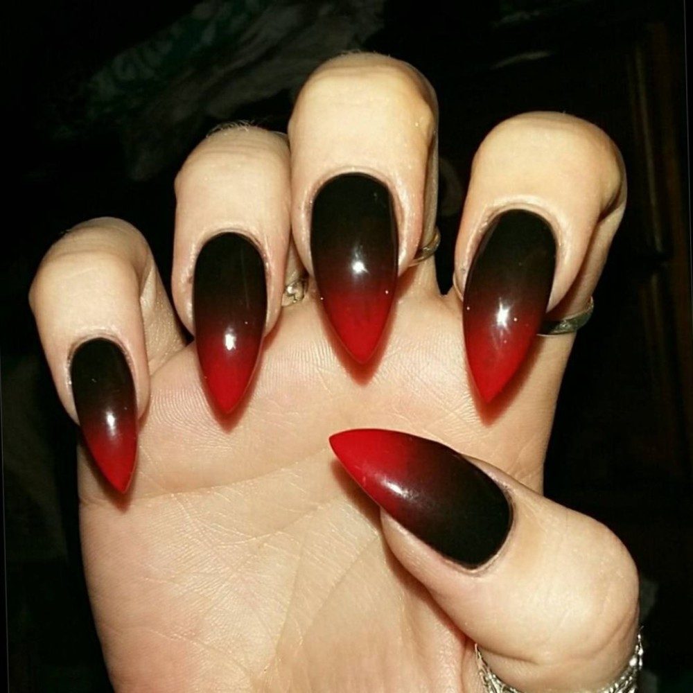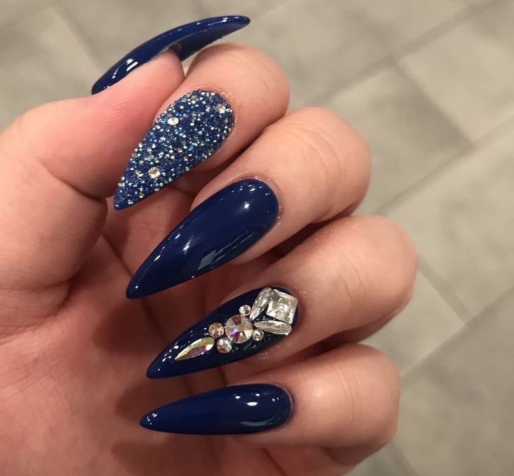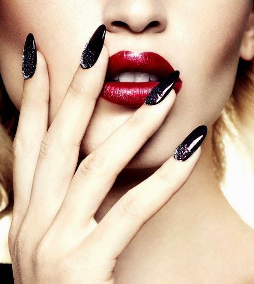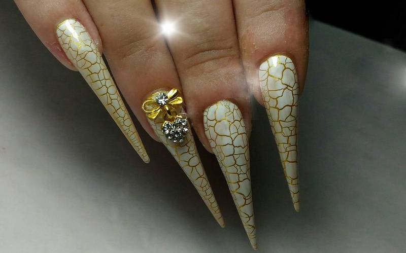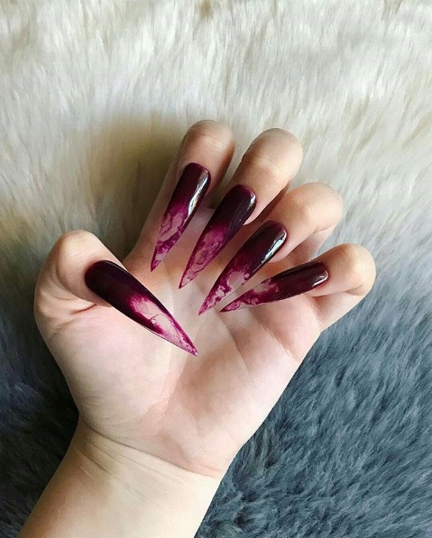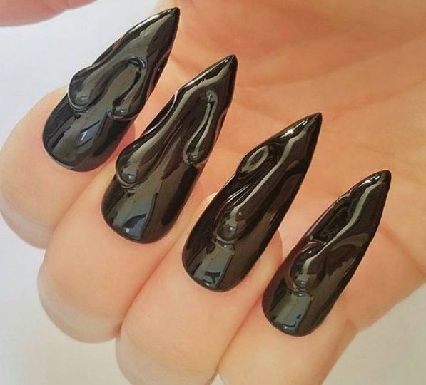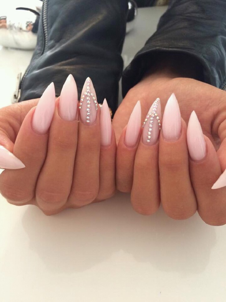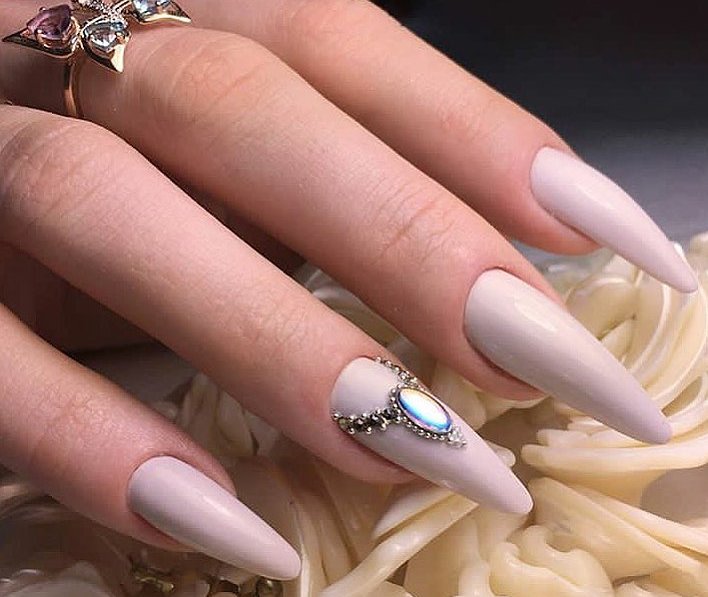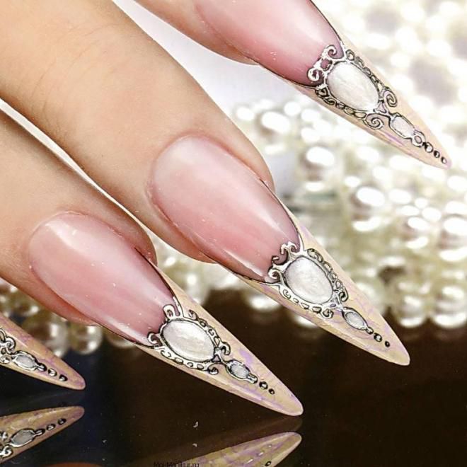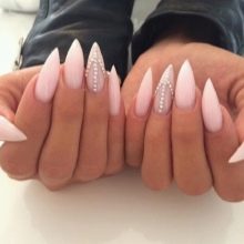 Pointed nails fit ladies with well-groomed hands. They look luxurious on the fingers of medium and short length with a neat elongated bed of the cuticle. This form of nails visually lengthens the fingers. On too long and very thin fingers stilettos will look out of place and ridiculous.