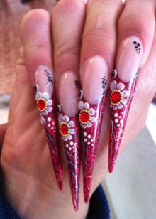 The volumetric design is created with the help of acrylic paints and gel. Polymer clay, rhinestones, beads also contribute to the appearance of volume. Often on the nail plate make large flowers.