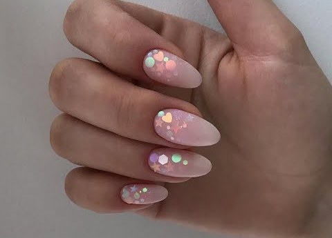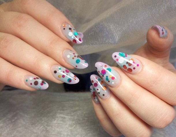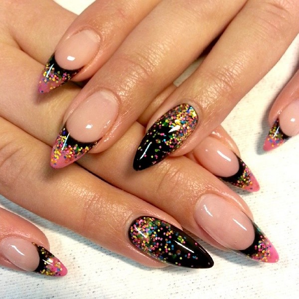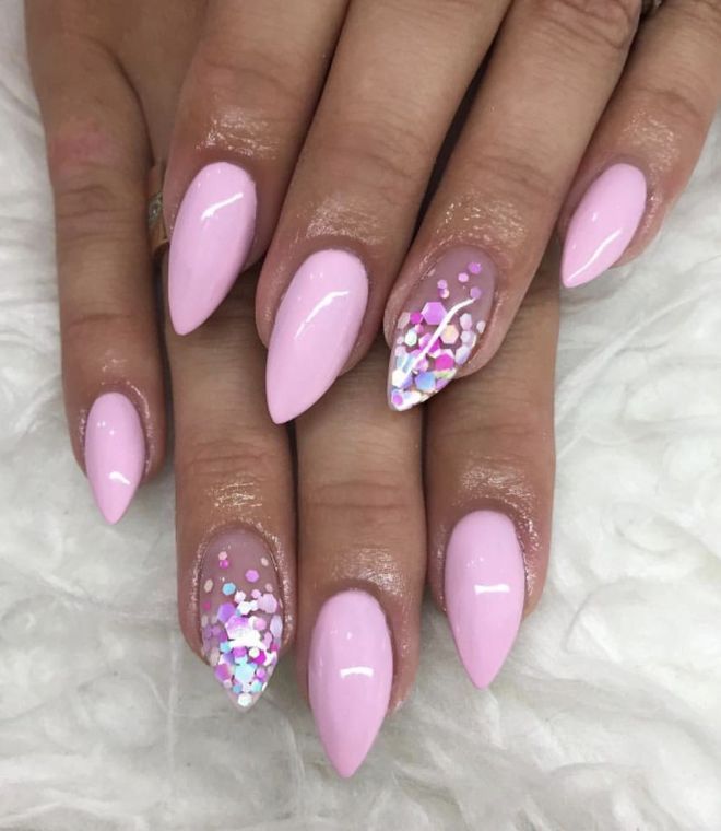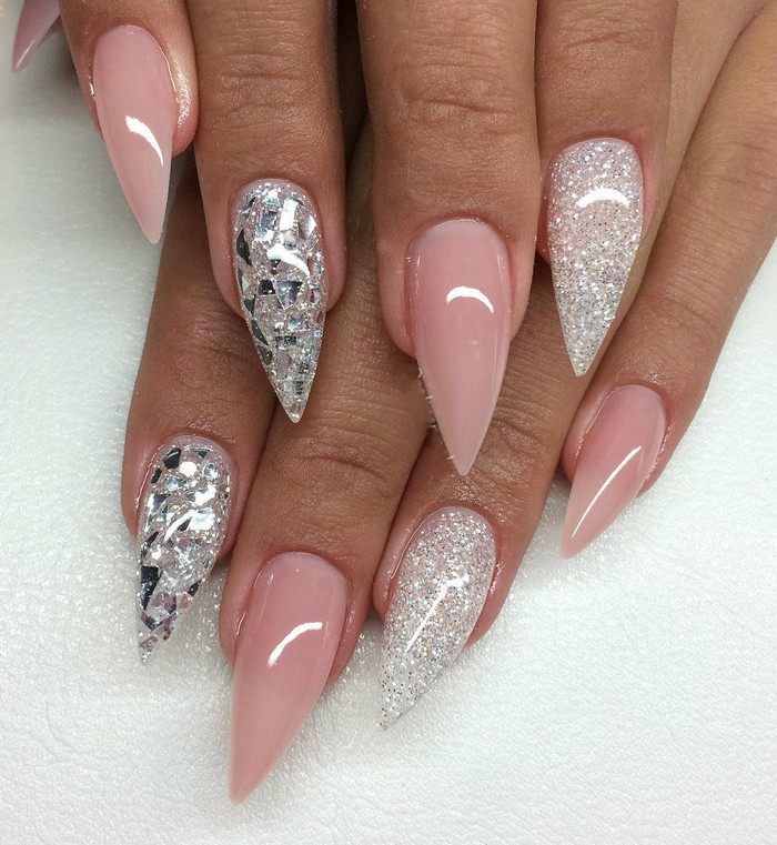 Especially popular is the new season - nails with shimmering sequins. Glittering plates of thin metal with a color coating are called kamifubuki. They give the pointed nails a unique look.