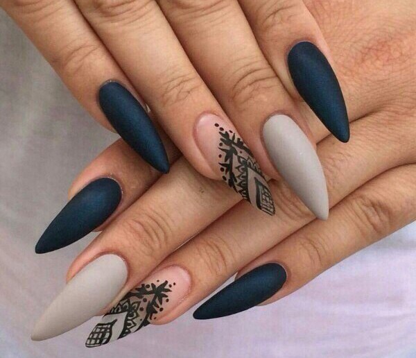 Crazy popularity is gaining game of textures: pearlescent, glossy, metallic, mirror, matte coating. Progressive masters combine them, apply gradient transitions. Sharp nails can be decorated with a gold ribbon, metallic thread. Experts combine matte and glossy coatings, using gradient transitions.