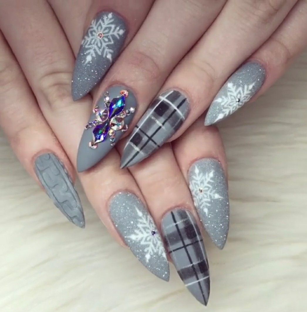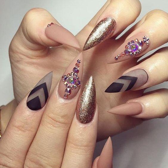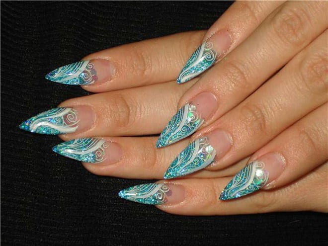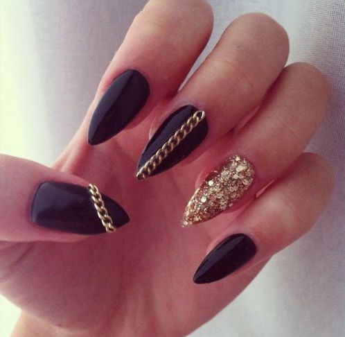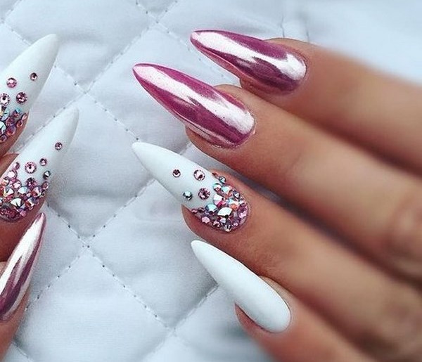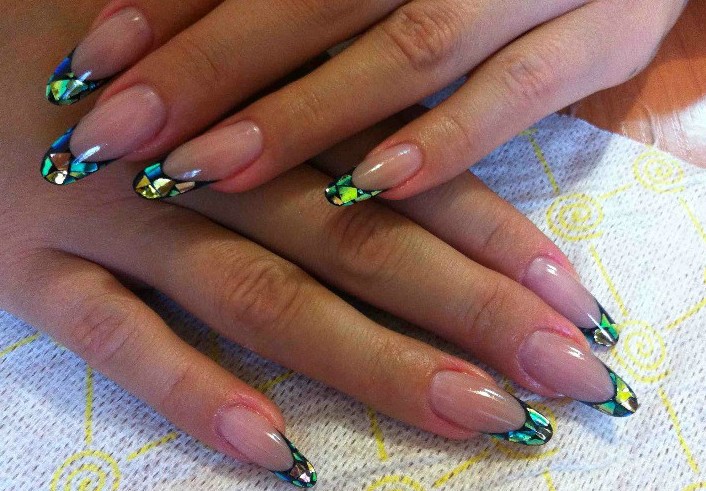 Manicure created with the help of metallized scotch looks exquisitely. Special acrylic or velvet powder, crystal chips perfectly suited for creating a design on pointed nails.