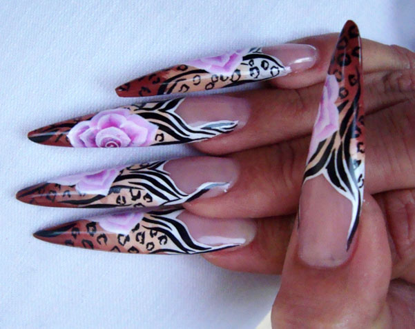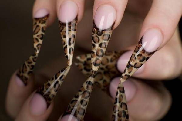 Animalistic design has not gone out of fashion for many years. Cats, dogs, tigers, lynxes, and other animals adorn pointed nails. Leopard print on long sharp nails is a bold and eccentric solution. Leopard spots can be depicted on a bright and bright basis.