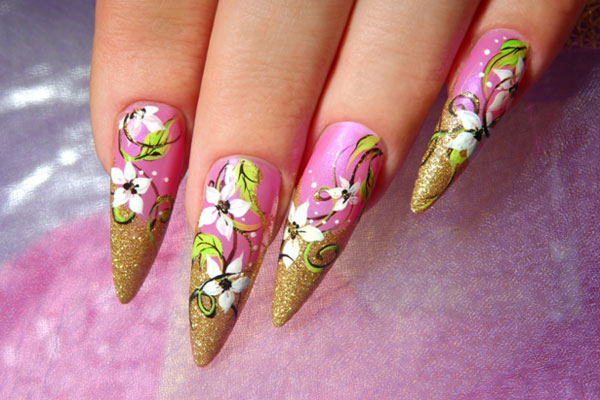 In fashion and natural design. With its beauty, the natural landscapes, images of mushrooms, berries, fruits are fascinating. The most sought-after patterns have always been flowers, so they often occur on the pointed shapes of the nail plate too.
