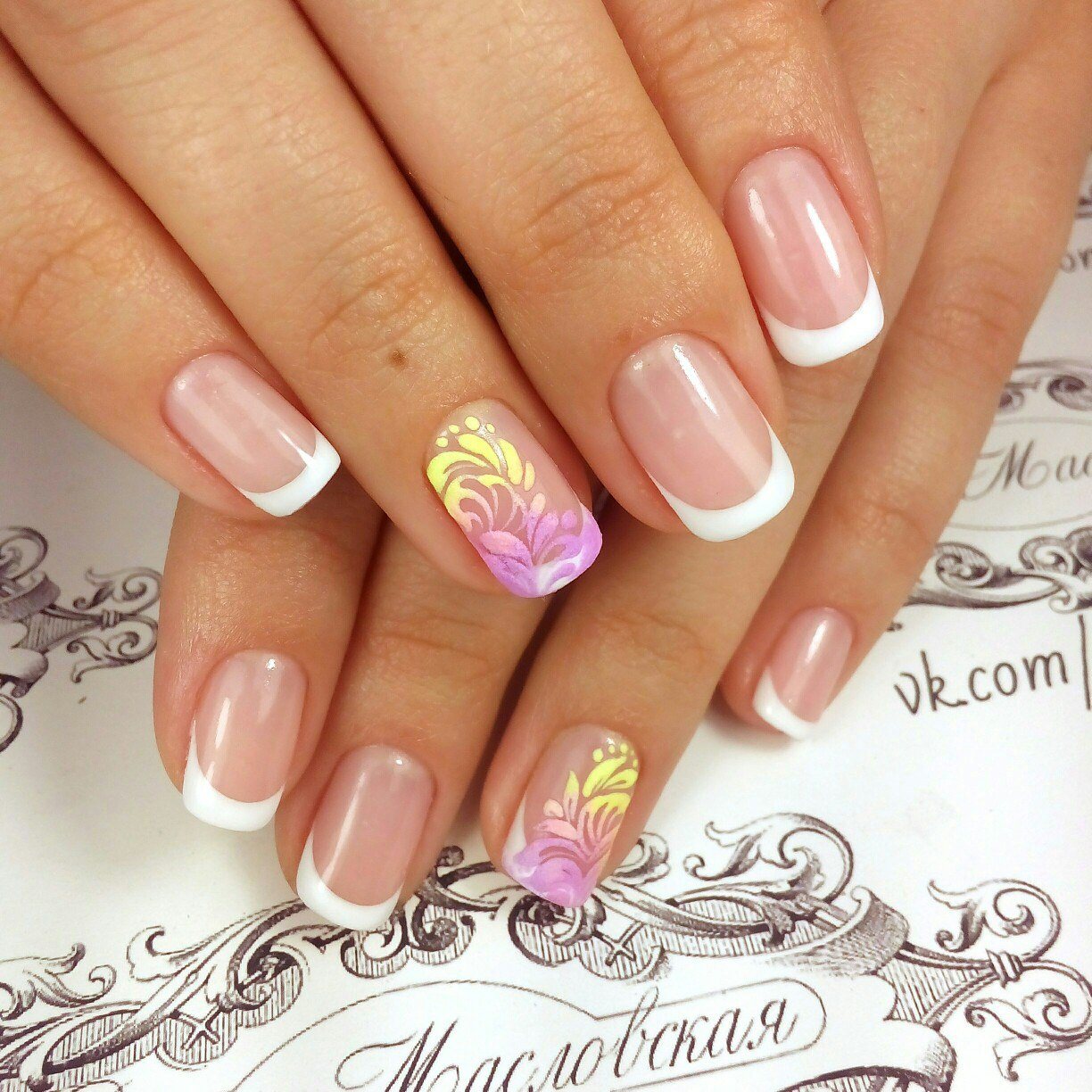- French will look even more interesting if you add it to the various patterns on the nails. It can be charming bows, flowers, stripes and other elements. Most often they are applied with acrylic paints.