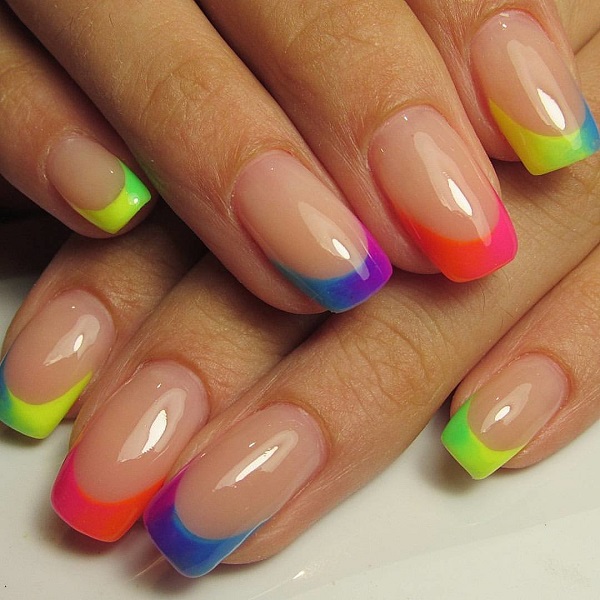 - Neon varnishes make french richer. Multi-colored combinations of red, blue, yellow and green neon tones can revive a manicure, making it very bright and original.