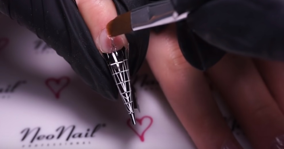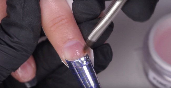 - After that, proceed to the most crucial moment - build. Tips or special forms are glued to each finger and stained with gel with a small brush without touching the edges of the skin. In this case, the edges of the forms should remain loose on a few millimeters. The nail is dried under a UV lamp - a similar procedure is needed not only to fix the gel, but also to remove fungi and microbes. It is important that while drying the fingers are motionless, otherwise the gel that has not been worked up to the end can be damaged.