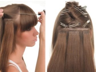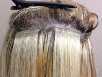 - Building with tapes. The essence of the tape extension is to mount relatively large locks of hair on a special adhesive tape. The use of this type has such significant advantages as: