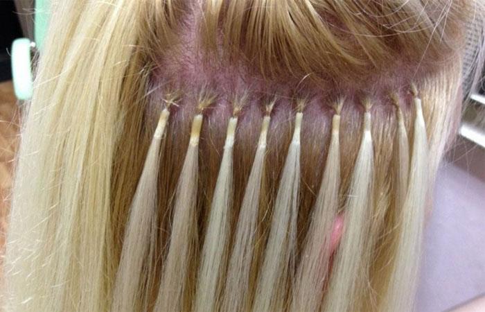 - Spanish buildup or buildup with special glue, but without the use of resin. This option is more suitable for building girls with blond hair. In this case, a small ball of glue is formed at the place of attachment of native and artificial curls, which then freezes.