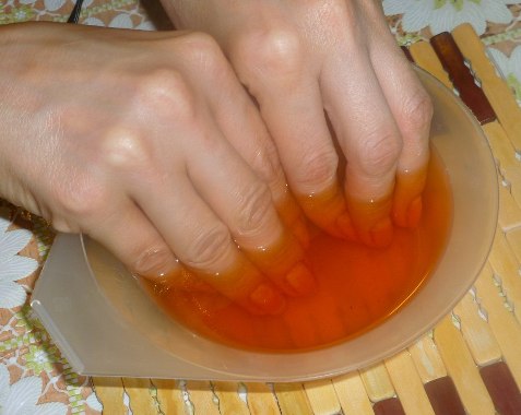- Immerse the fingertips in the solution. The time depends on the purpose of the event and varies from 10 to 30 minutes. If the procedure is performed for the purpose of treatment, then such manipulations should be repeated every day until the symptoms of the disease have passed. This usually occurs within 1 month.