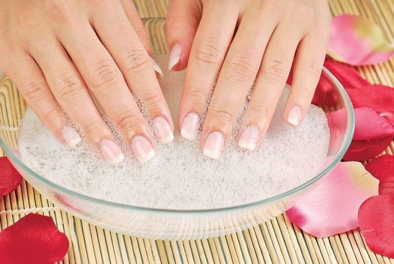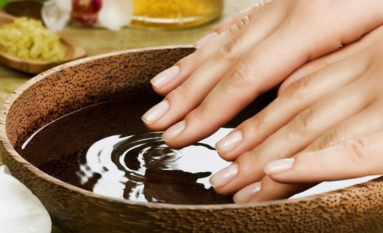 In water heated to 40 ° C, you must add salt (2 tablespoons) and soda (2 tablespoons). The resulting solution is useful for strengthening the nail plates and the prevention of fungal diseases. The duration of the procedure is 15 minutes.