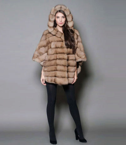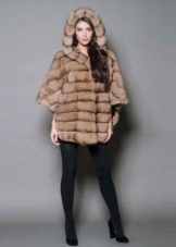 A great transverse variant is demonstrated by this model. The stripes differ from each other in shade, which makes the fur coat interesting. In one of these strips pockets are hidden, which only the owner of the mink car fleet knows about, they are so invisible. The hood in this model is missing, but what a chic collar, and even decorated with a brooch. That's what it means when they talk about the self-sufficiency of the model. Loose cut fur coats perfectly with a short fitted skirt.