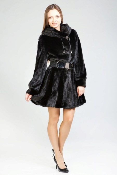 The flared version of the shortened fur coat with a hood, sleeves on the cuff, with a wide strap is an easy option for a young girl.
