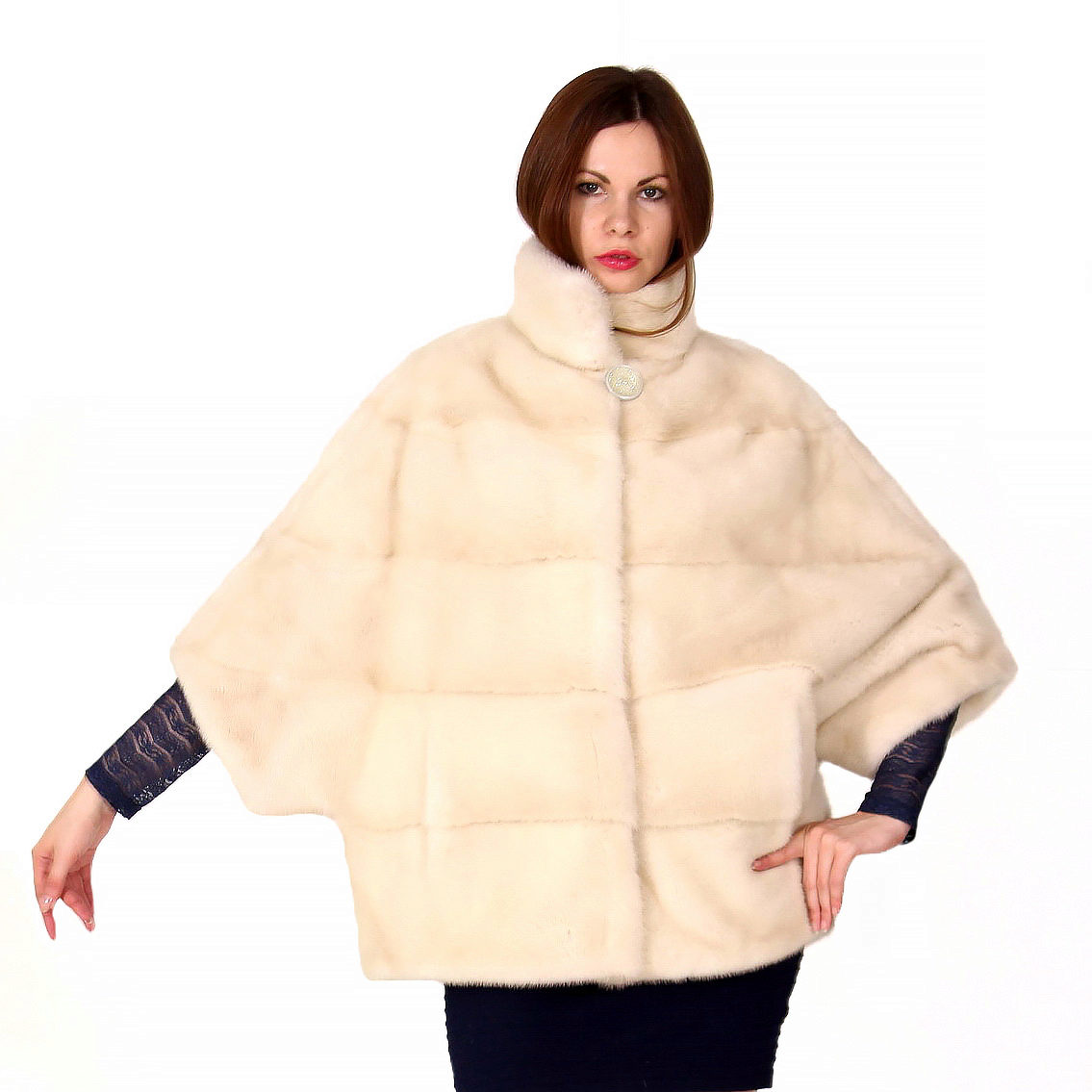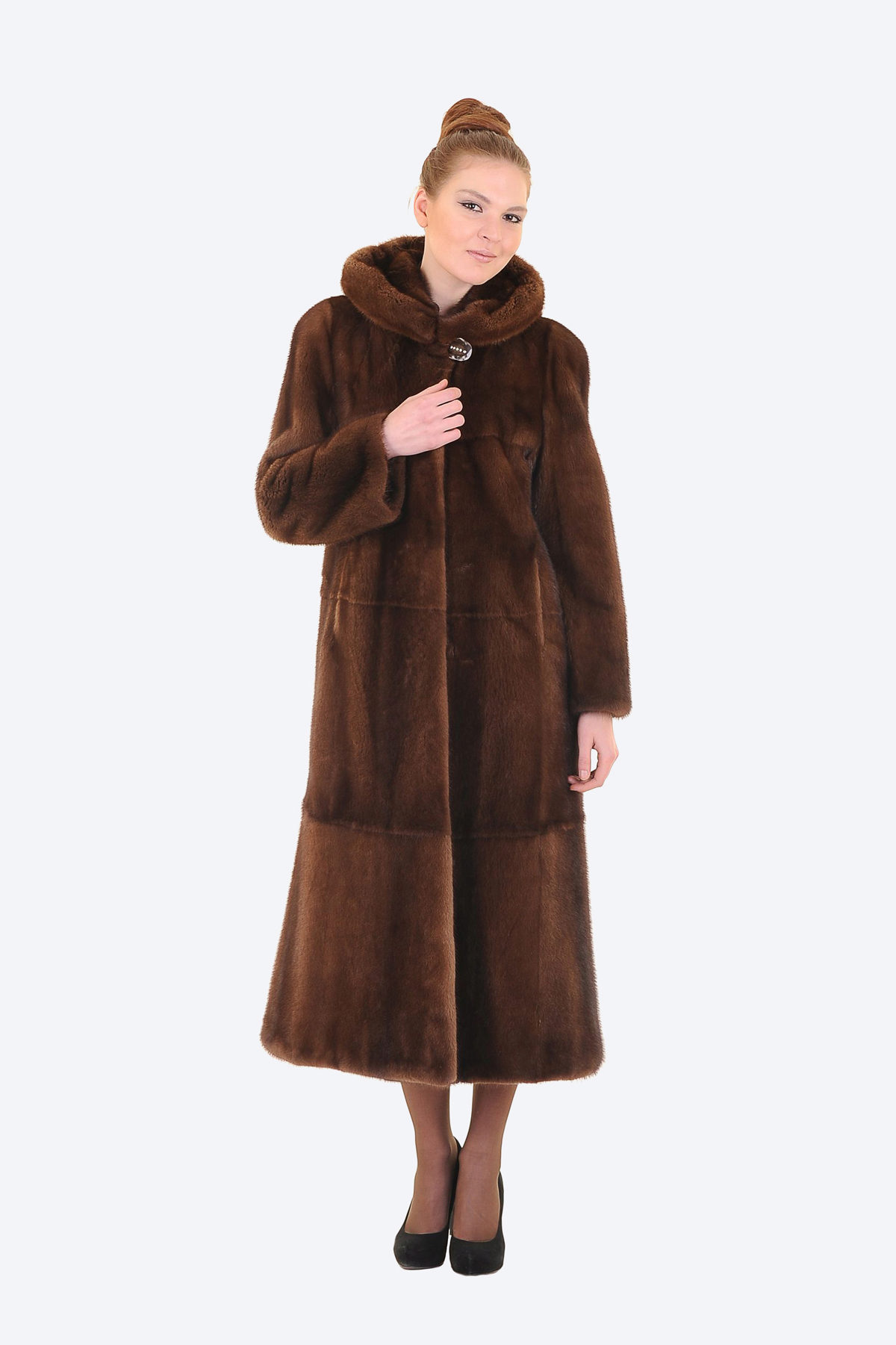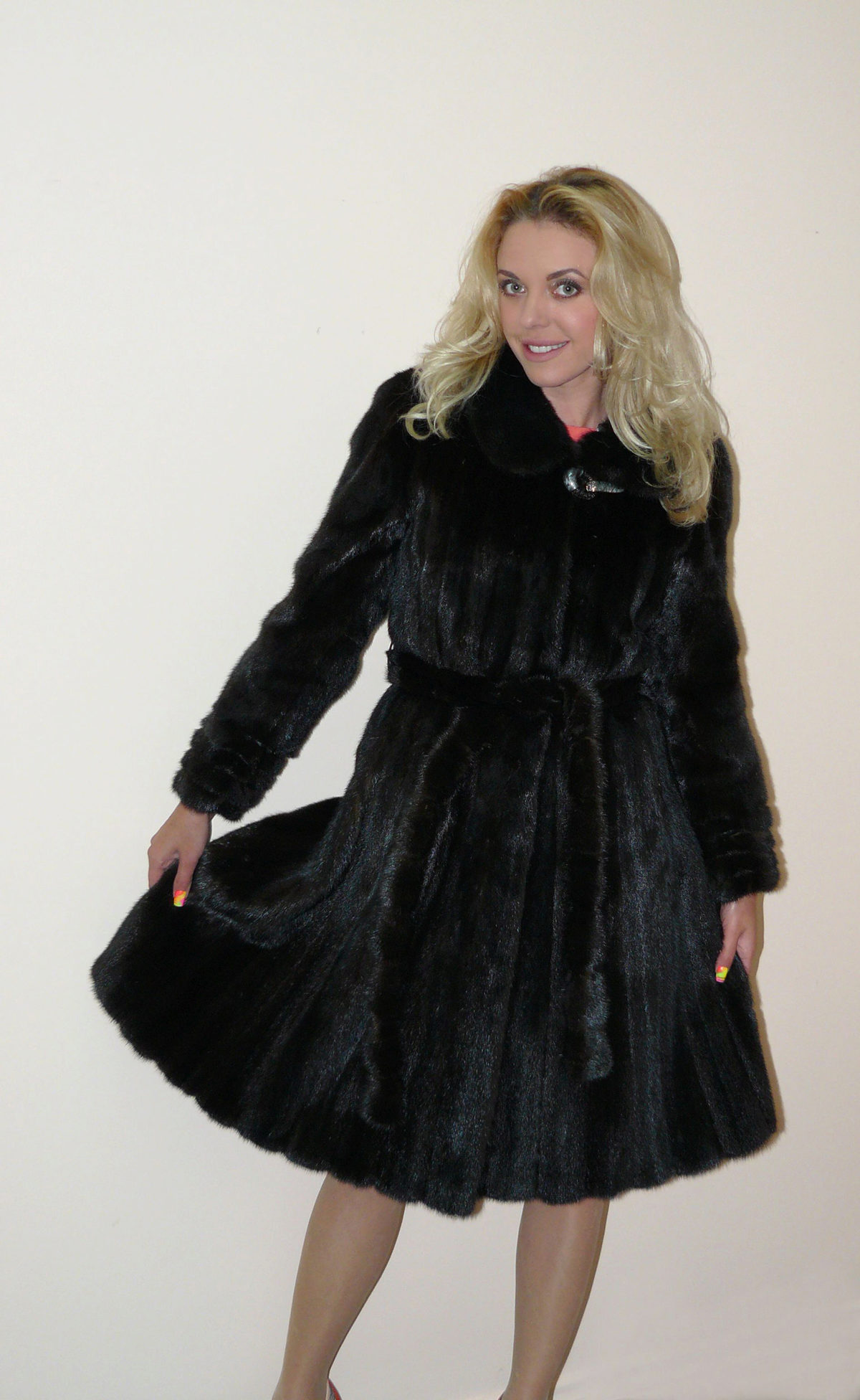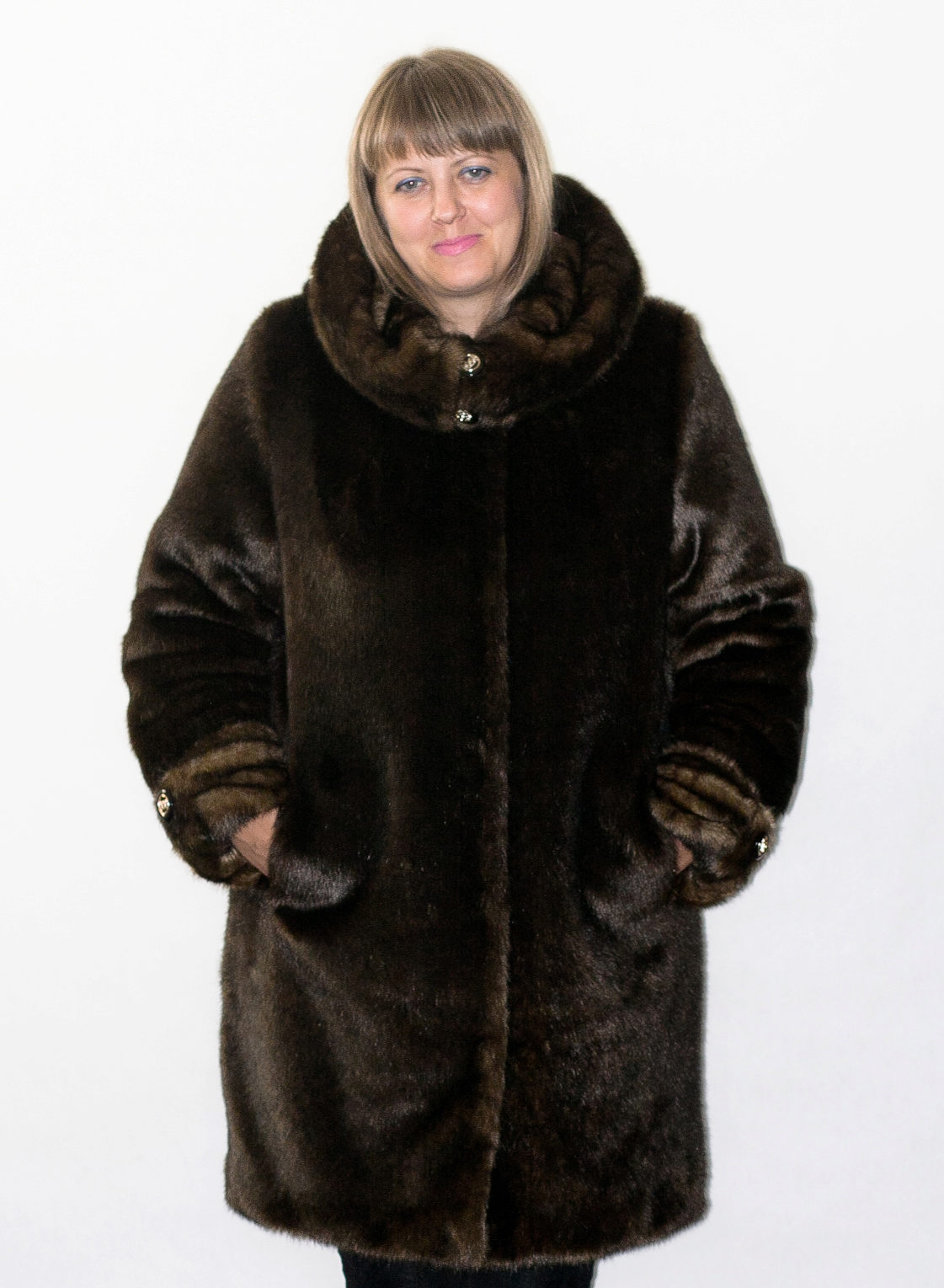 Looks great straight cut of mink. The color, beautiful with modulations, focuses attention on the fur coat itself, while distracting from the forms of its owner. The model is so bright and interesting by itself that any accessories would be superfluous.