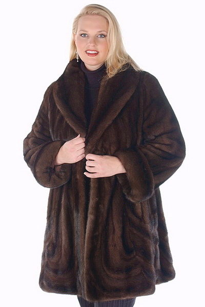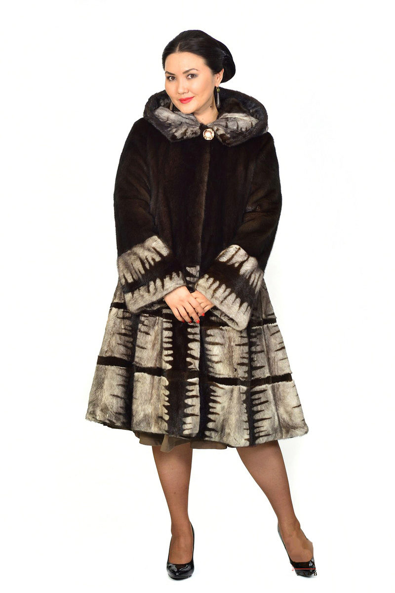 The popularity of lightly narrowed short fur coats of dark colors or using contrasting fur for several seasons has motivated designers to make new decisions. Such models look very modern, slim and perfectly mask figure flaws. But the horizontal hem makes the figure squat, which is completely out of place for full women.