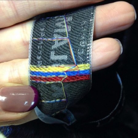 From the wrong side of the tag should be stitched three stripes - red, yellow and blue, and in this sequence.