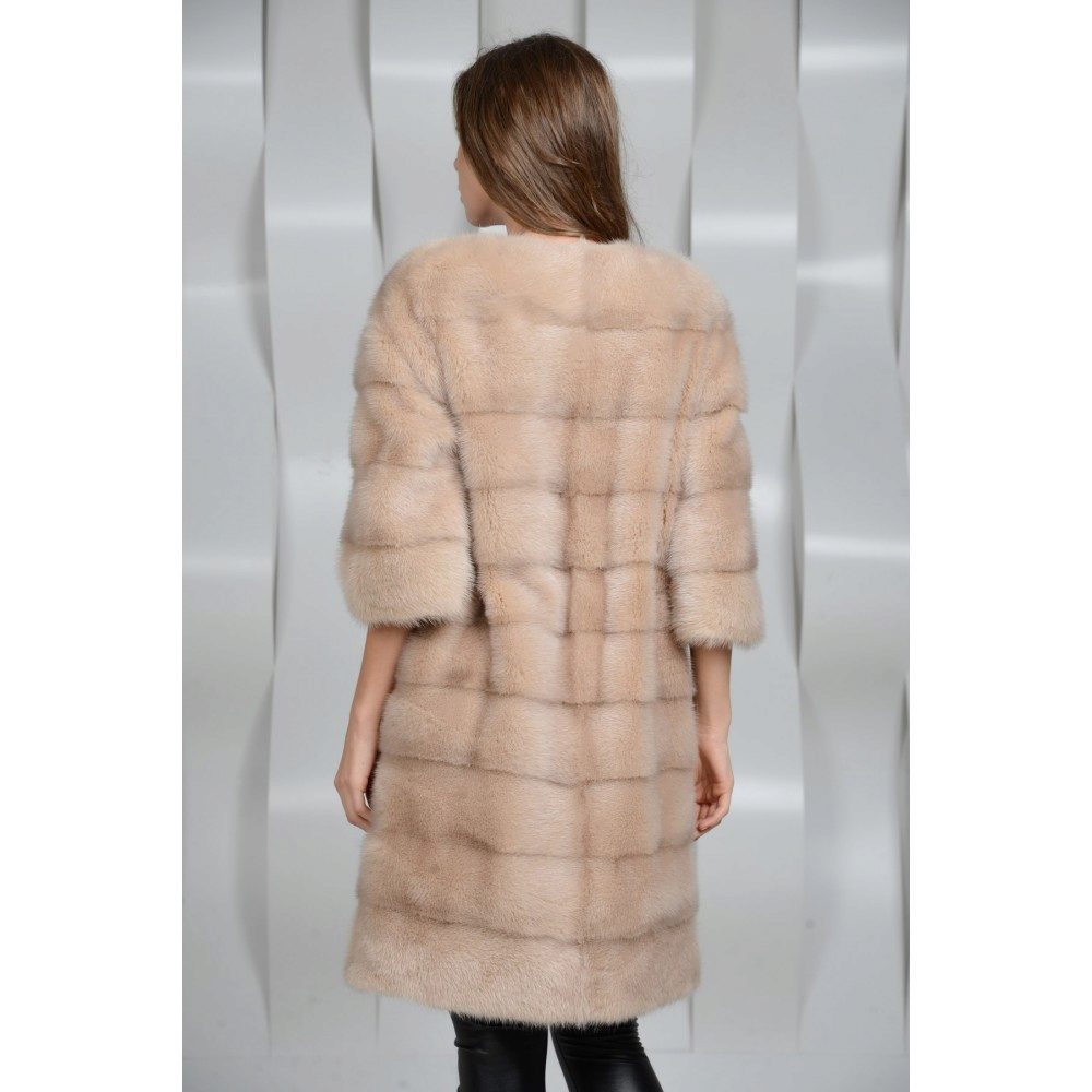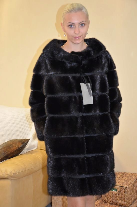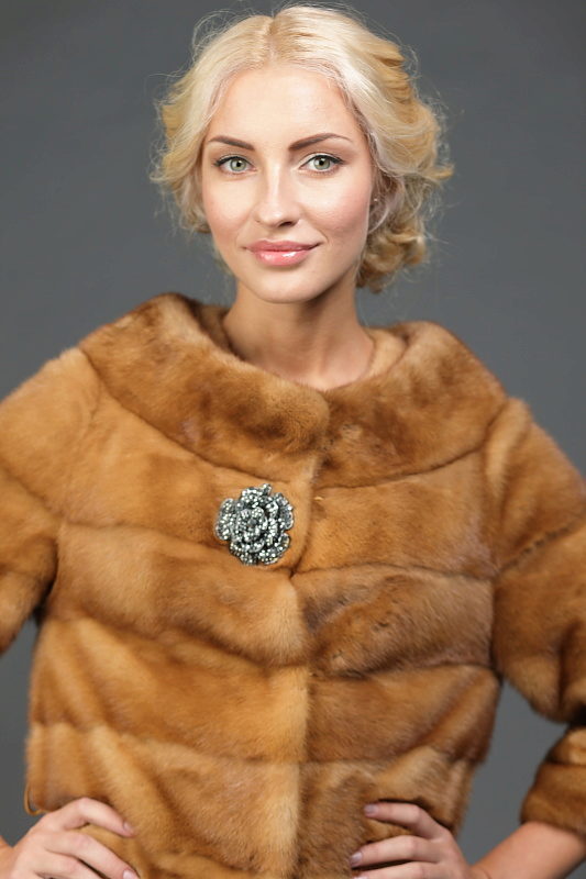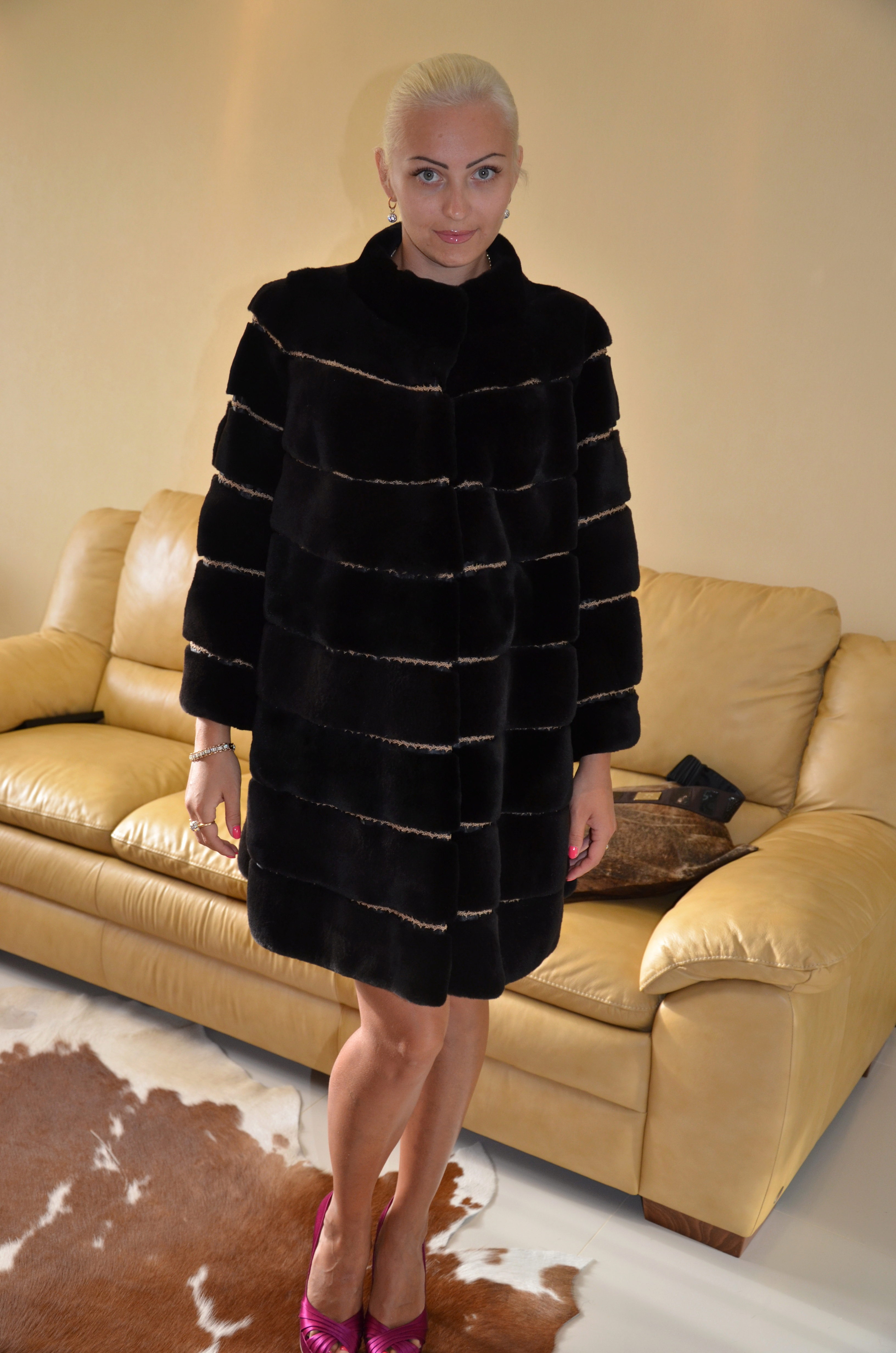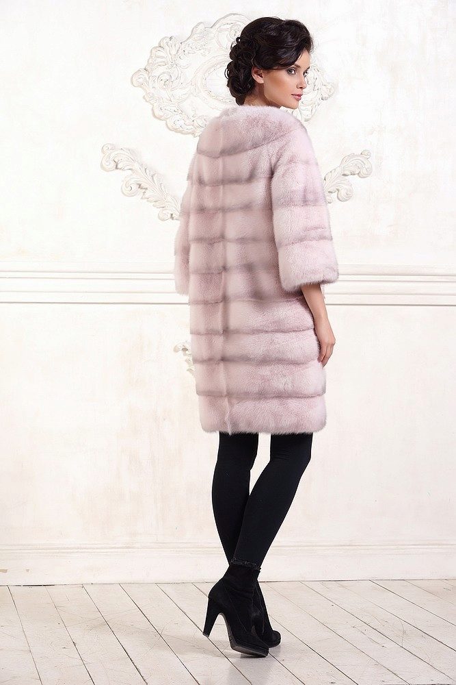 - Classic. Slightly fitted product, emphasizing femininity, and with a slightly extended bottom. The length of this fur coat reaches the knees. Sleeves ¾, but in some embodiments they have the traditional length. The small collar smoothly passes into the shoulder line.