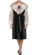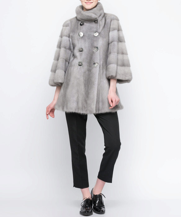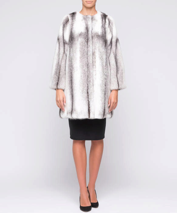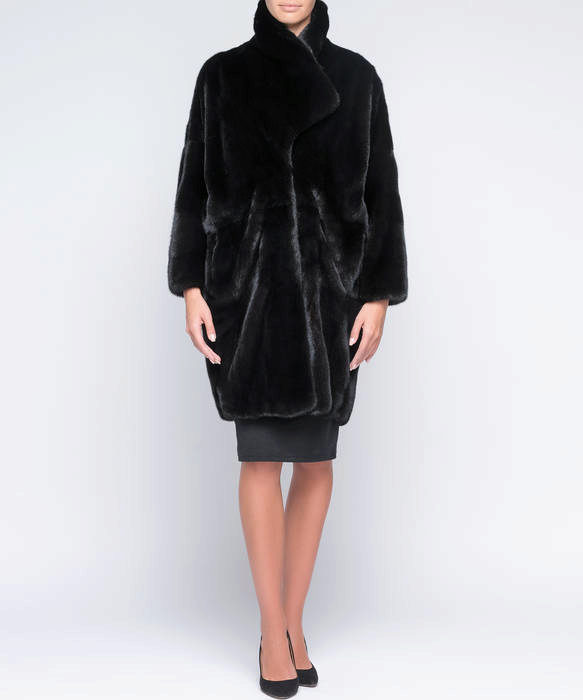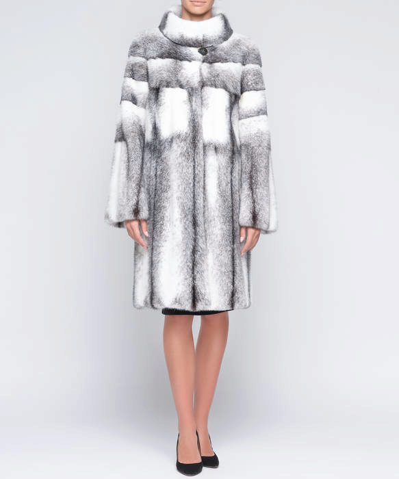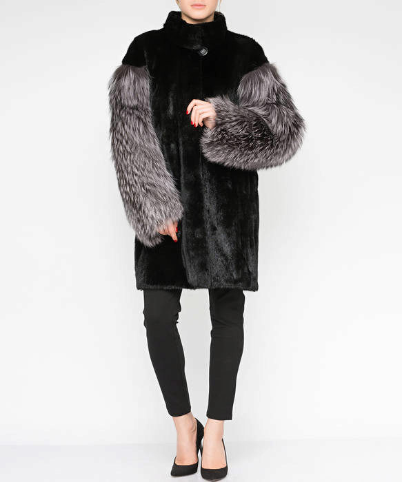 The original model for a slim figure.A shortened mink coat would have looked modestly (simple straight cut, laconic stand-up collar), if it were not for the bulk sleeves of fluffy silver fox fur. The highlight of the model is that they start not from the shoulder line itself, but slightly lower. The classic black color of the mink is set off by the silver variegation of the black-brown fox, creating a bold extravagant image.