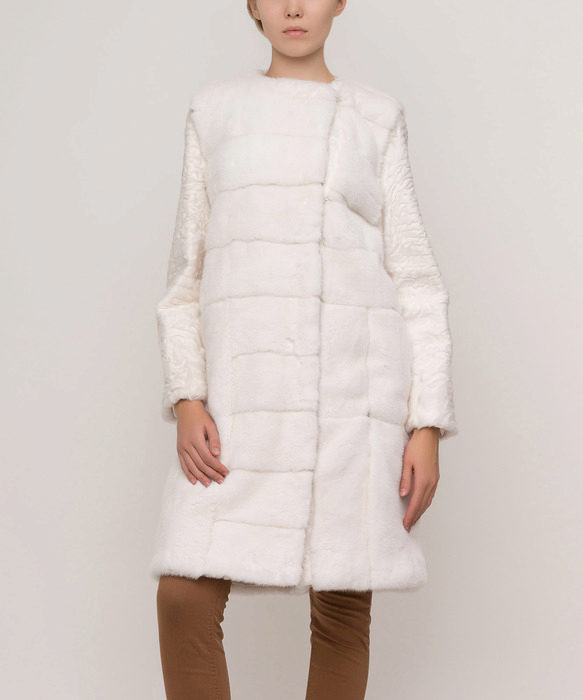 In this embodiment, there is also a combination of different types of fur, but it looks quite different. A classic-length coat of dazzling white color looks elegant, more suitable for a sophisticated girl. A graceful, rounded neckline instead of a collar will accentuate a beautiful neck. And the astrakhan sleeves and asymmetrical buckle add an element of originality.