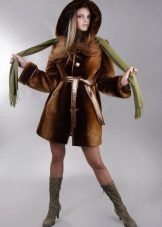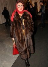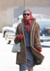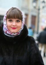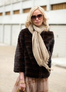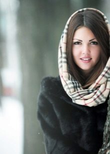 - A scarf tied in the so-called "Hollywood" style looks elegant and stylish. The color of the accessory in the same color as the color of the mink coat, except that it is lighter in tone. Note that the brown color of the scarf is surprisingly in harmony with the girl's brown eyes and the color of her skin, creating a complete image.