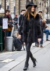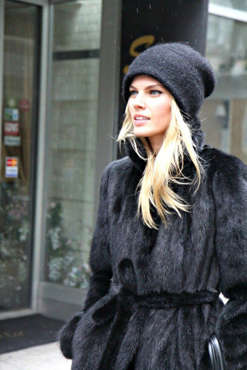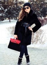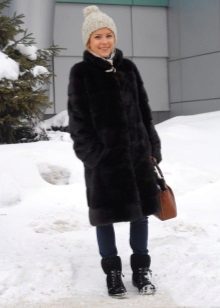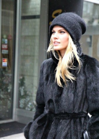 - Fashionable black knitted hat-toe is suitable only for a young fashionista. The hat is the same color as the fashionable fitted mink coat with a belt. However, this combination does not look boring due to the fact that the girl is a bright blonde.