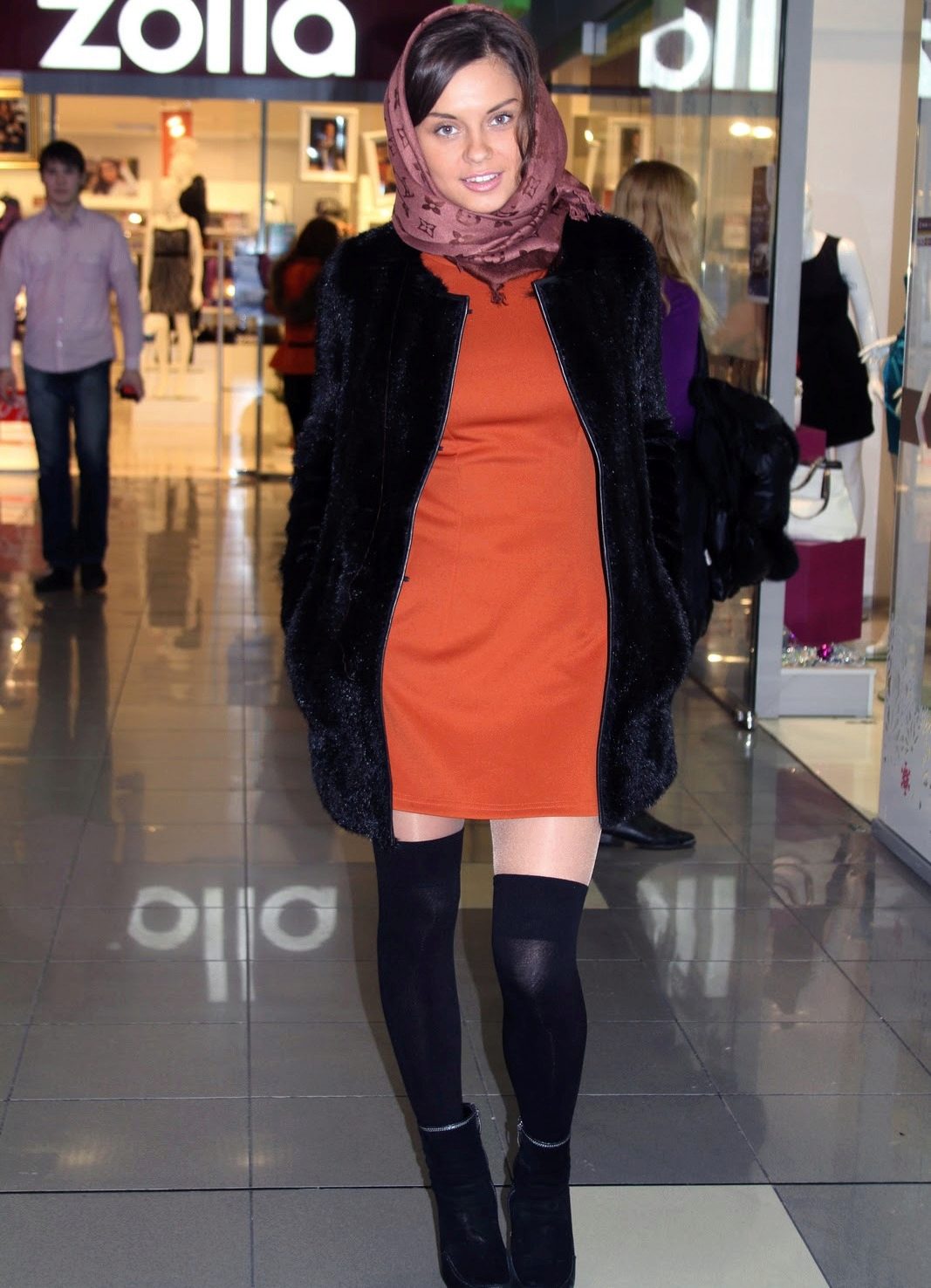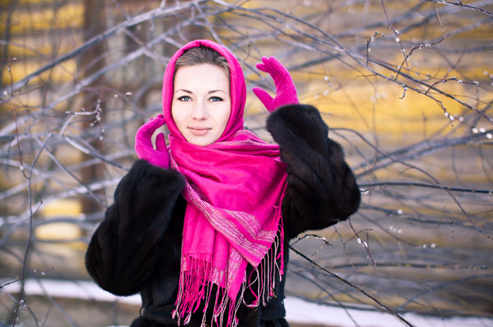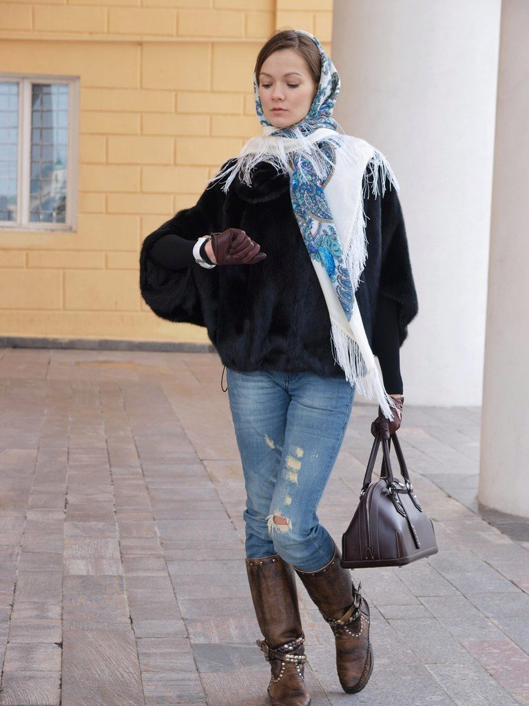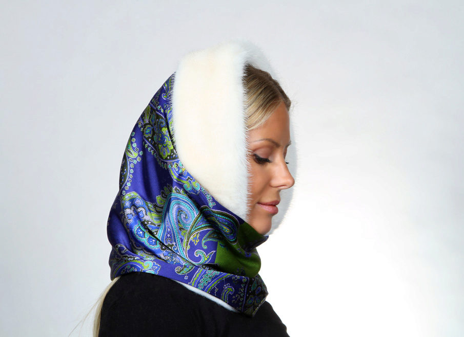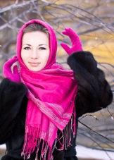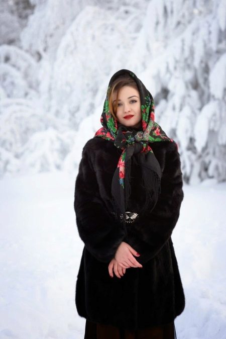 Winter scarves knit look original with youth mini fur coats. The traditional Russian bright Pavlo-Posad scarves are incomparable. The universal version for any model is a white down headdress.