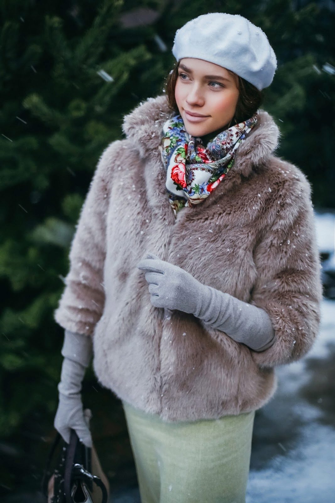 - To make the image complete, try to find one more element of the same color (gloves, neck scarf) for the headdress. If the fur coat has a collar of a different color, then the matching of the colors of the collar and the cap will suffice.