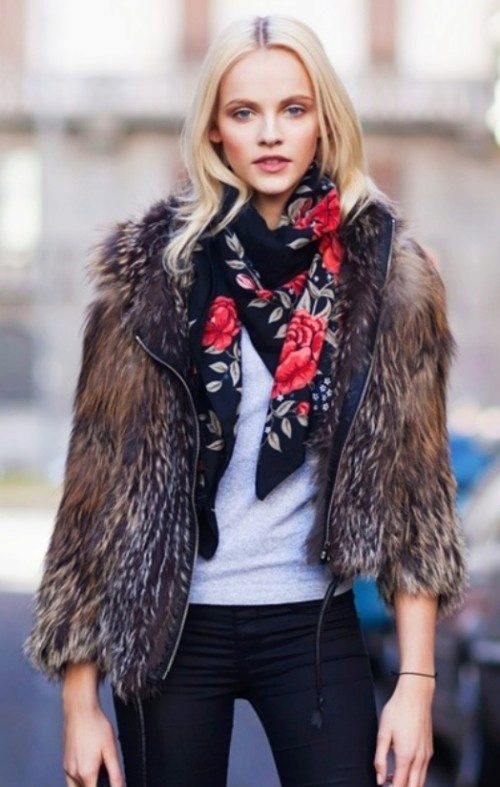 The color of the accessory can be different, but in combination with the fur a fine print looks especially stylish. No need to get involved in too many-colored patterns on the headdress (maximum - two main tones).