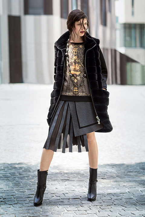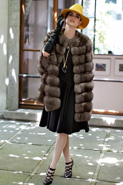 Another popular model is the “English coat” with a clear shoulder line. Fur coats of medium length, straight or fitted. Characteristic, but not mandatory features of it are stand collar, sleeve bell.