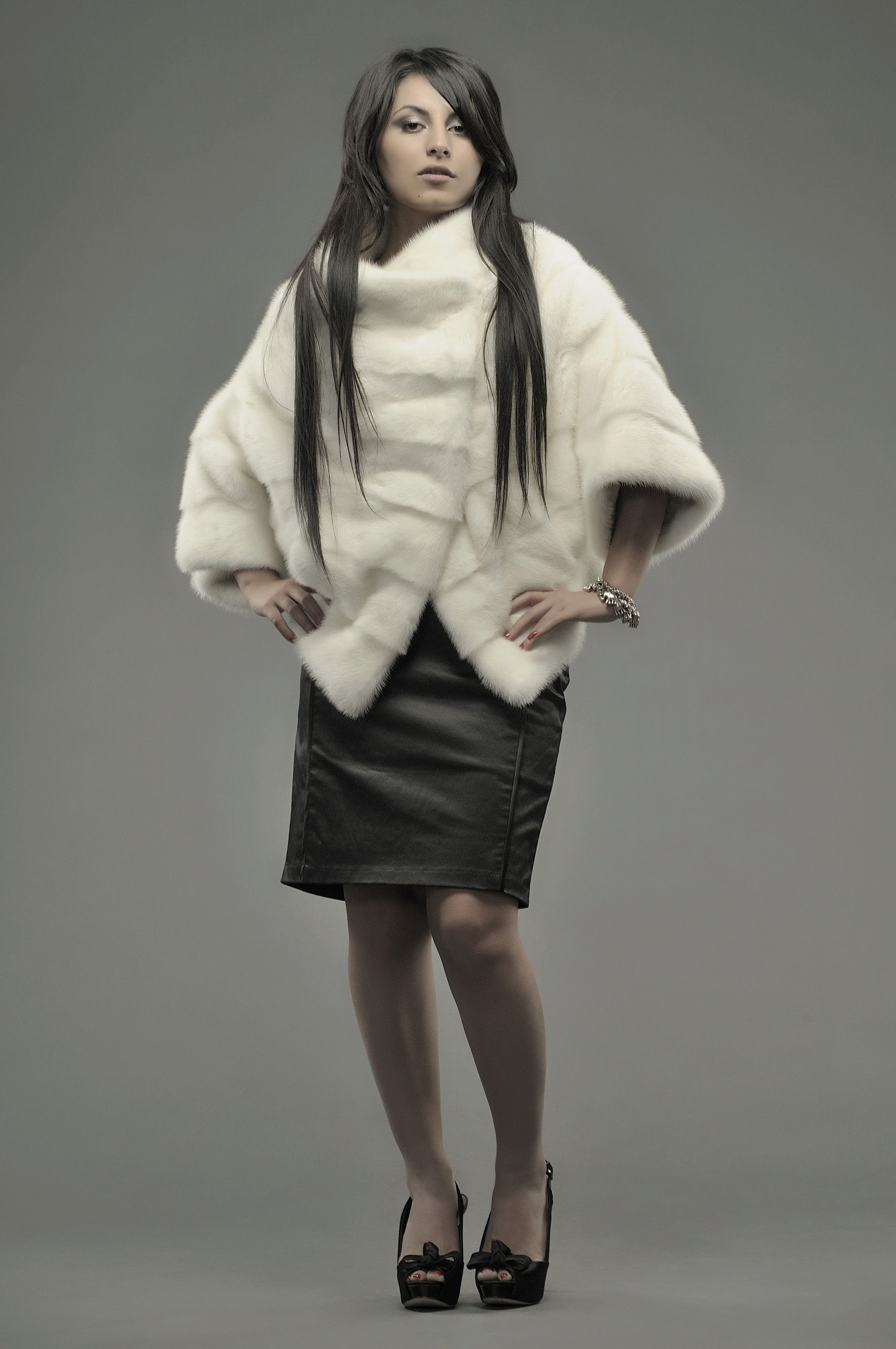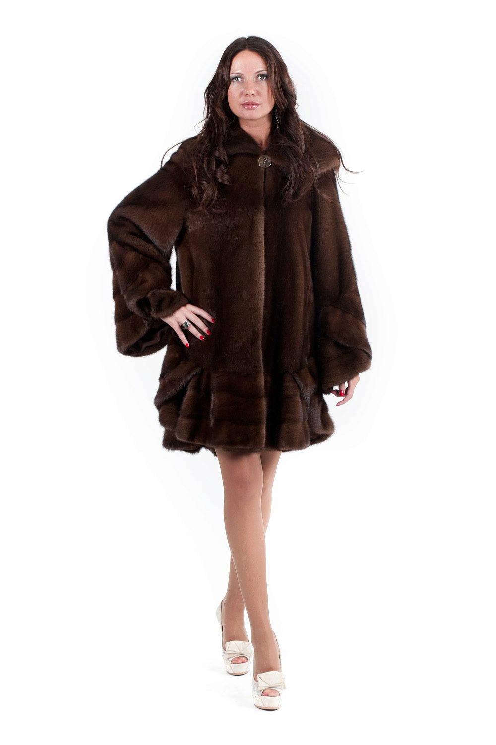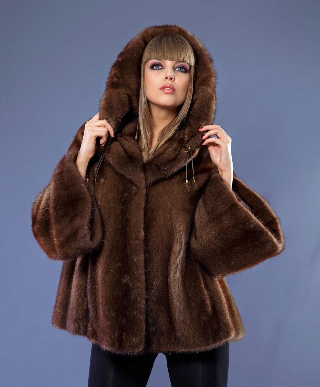 The “bat” model is a fur coat with sleeves wide at the base, like a cape or poncho. The length of this coat varies from below the belt to above the knees.