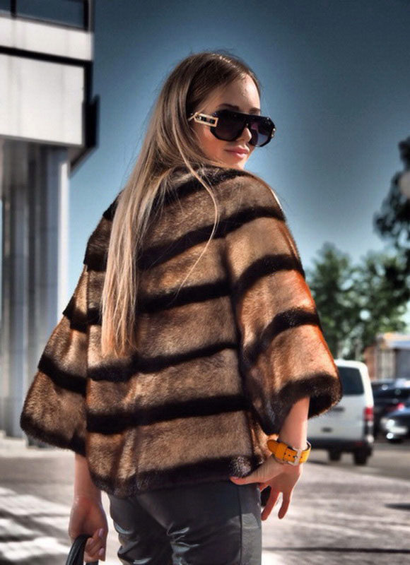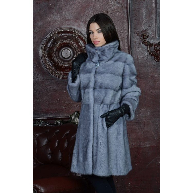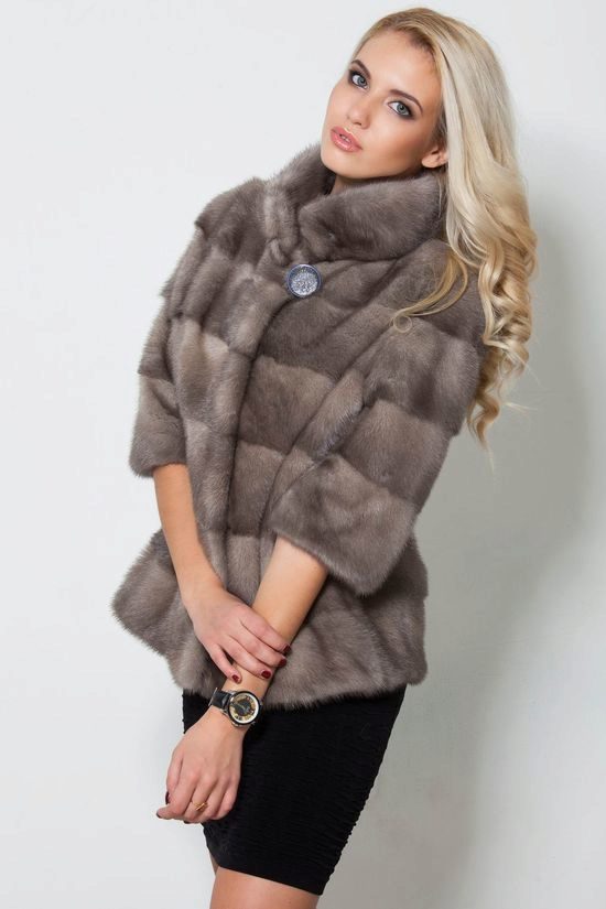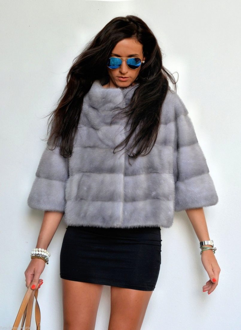 The short short fur coat of blue mink is belt-length and made in transverse stripes. The shortened 3/4 sleeve gives the model modernity and lightness. A wide stand collar accentuates the look. The color of "blue mink" as if intended to emphasize the elegance of the model and the freshness of the image. This model for practical and young girls is suitable for all occasions - and on a date, and in the office and in the theater.