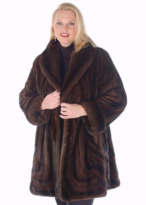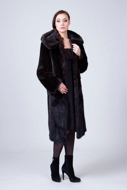 An interesting model of a fur coat "oversize" of dark mink length below the knees with rounded floors. The floors are sloped from the knees in a semicircle, the fur coat is made in the transverse technique of strips. Clasp in the form of a large decorative buttons. The shawl collar, trimmed with other fur with a long nap in a similar cross technique, draws attention. The sleeves of the fur coat are long, straight and wide. Ideal for obese women.