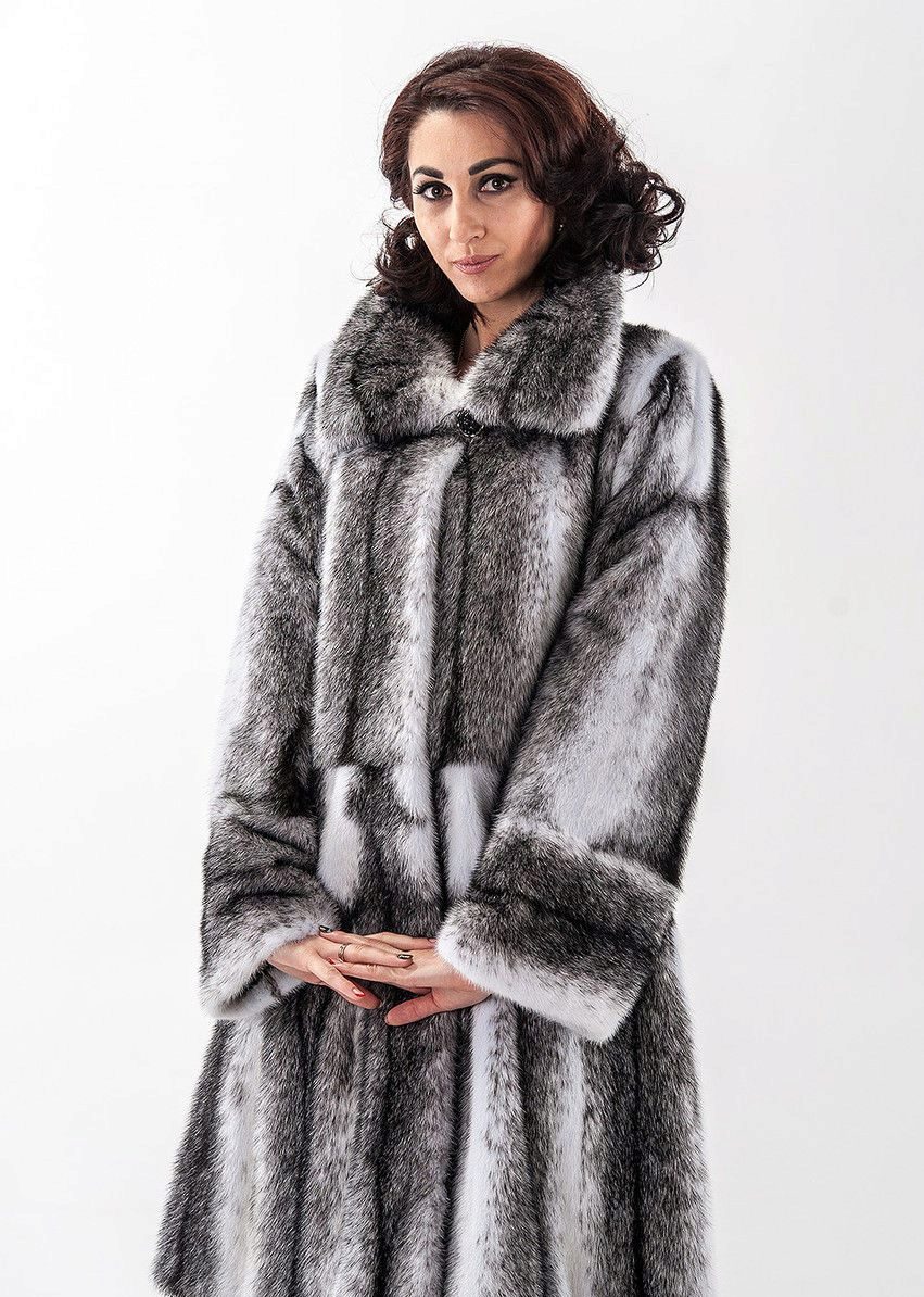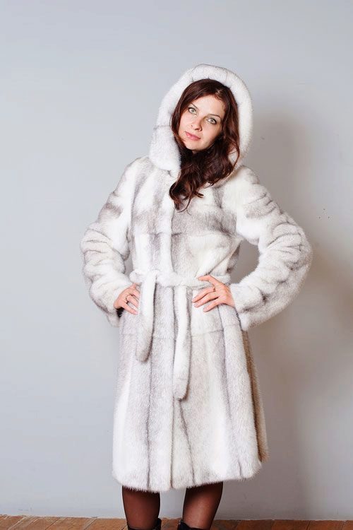 Another distinctive feature of a mink-cross coat is that any girl in them looks slimmer. The darkened stripes on a light background, located vertically, make the figure thinner and more elegant, distract attention from shortcomings.