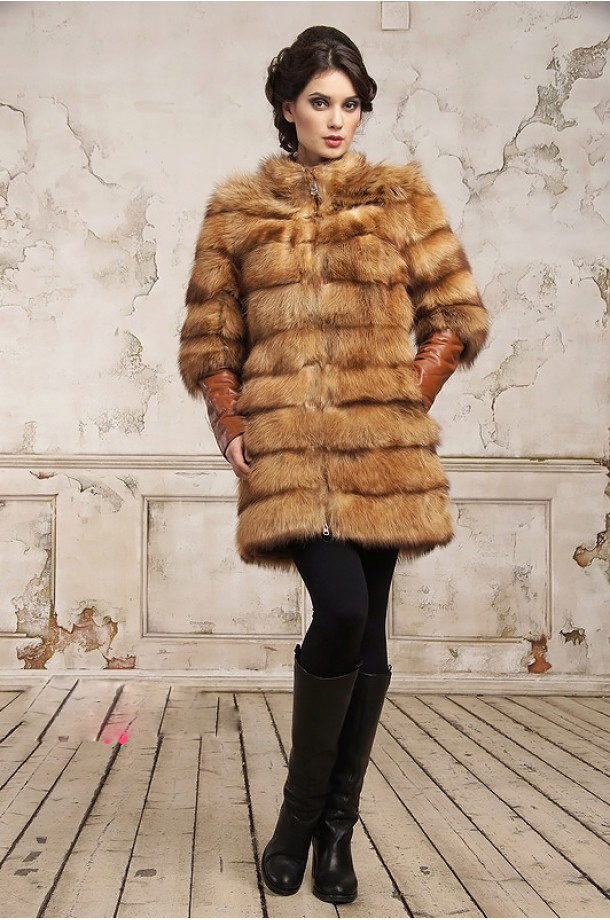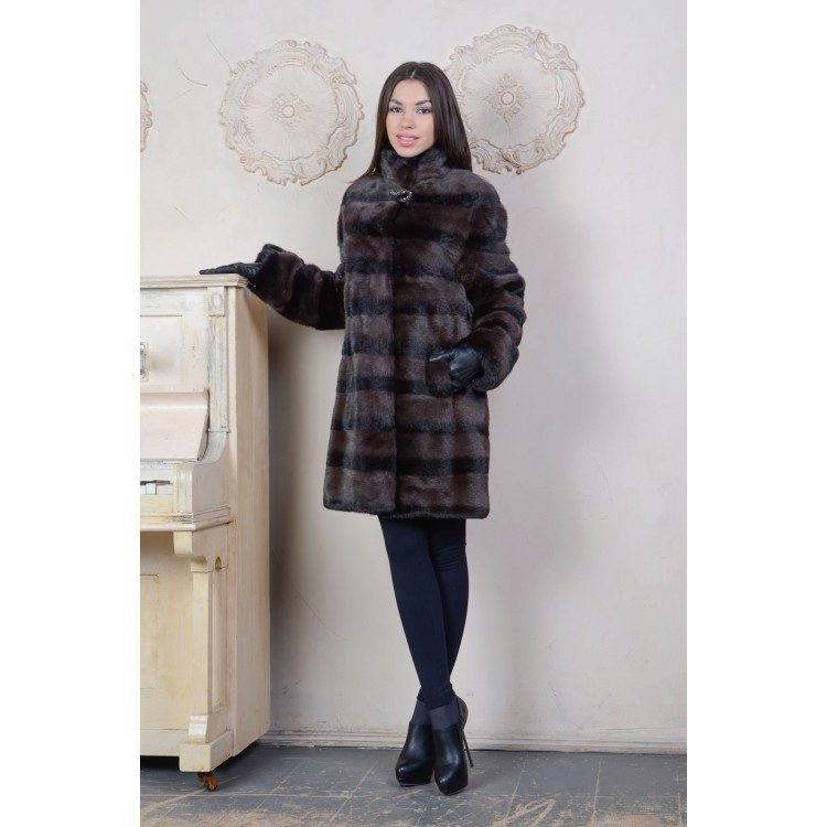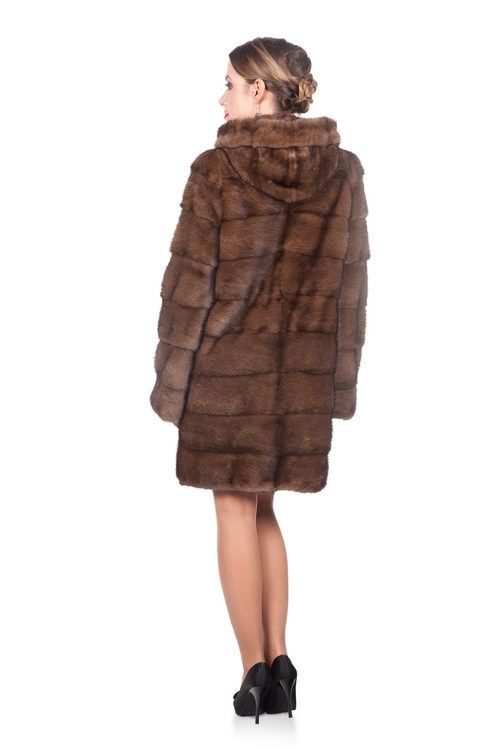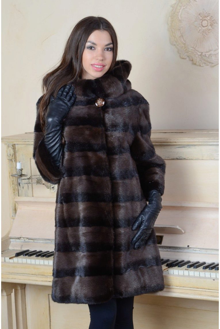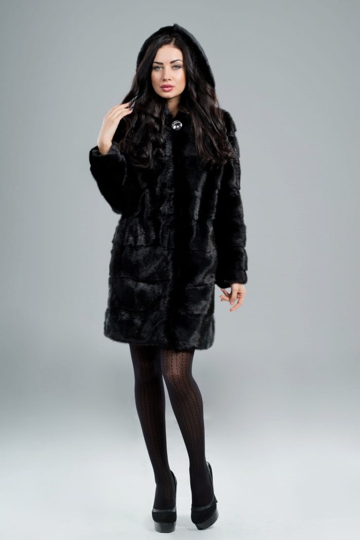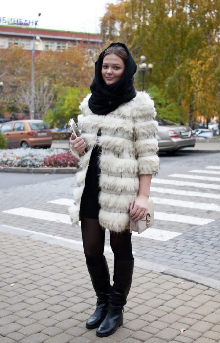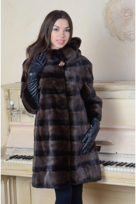 A fur coat to the knee with a hood has a very unusual coloring: thanks to cross-stitching, with a combination of wide brown and narrow black stripes, you get a rather interesting and effective product. You can combine such a fur coat with skinny pants, leggings, skirts or leggings. As shoes fit boots or ankle boots with heels.