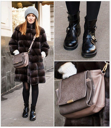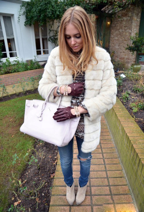 A bit unusual, but stylish combination is obtained, if you wear a brown fur coat of classic length to the knee, which has a sleeve to the elbow, on the most ordinary leather jacket in black. Combined with beige skinny pants and black winter ankle boots for a casual look. And in order to give him a slightly playful mood, you need to pick up stylish accessories in the form of golden bracelets and a small brown clutch.