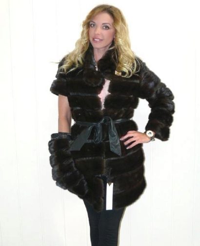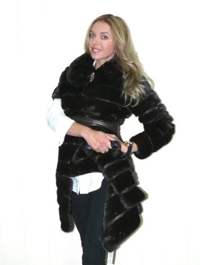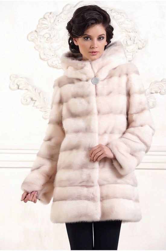 From the technological point of view, the cut is “more difficult” to dissolve. Before sewing, the mink skins are cut into narrow strips, after which they are sewn, resorting to vertical displacement. As a result, each skin becomes narrower and elongated. These coats are ideal for ladies with magnificent forms, in them they will be able to emphasize all the undoubted advantages of their figure, and the fur coat will delicately hide all unnecessary and make the silhouette slimmer.