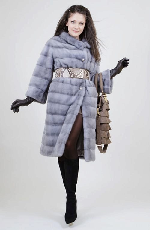 An interesting option are mink coats of gray-blue tones. They are extremely gentle and elegant at the same time. There are a lot of blue shades of mink. For example, the fur, called "sapphire", looks gorgeous. It looks very expensive and rarely there is a light version of mink fur called "violet". The fur coat from this fur, complemented by a sable hood, looks luxurious.