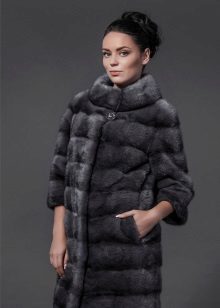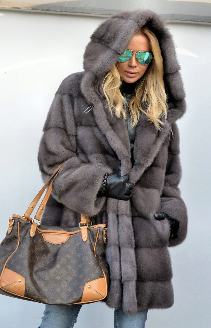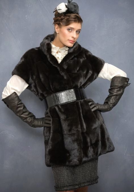 Short fur coats never went out of fashion, they are elegant and practical. So the fur coat presented in the photo, of a noble gray color, with a bluish tint, will always highlight your beauty. The sleeves are very easy to unfasten, but they do not turn into a vest, but into a fur coat with a sleeve ¾, which is always suitable for an evening out. Under it you can wear long gloves, for example black.