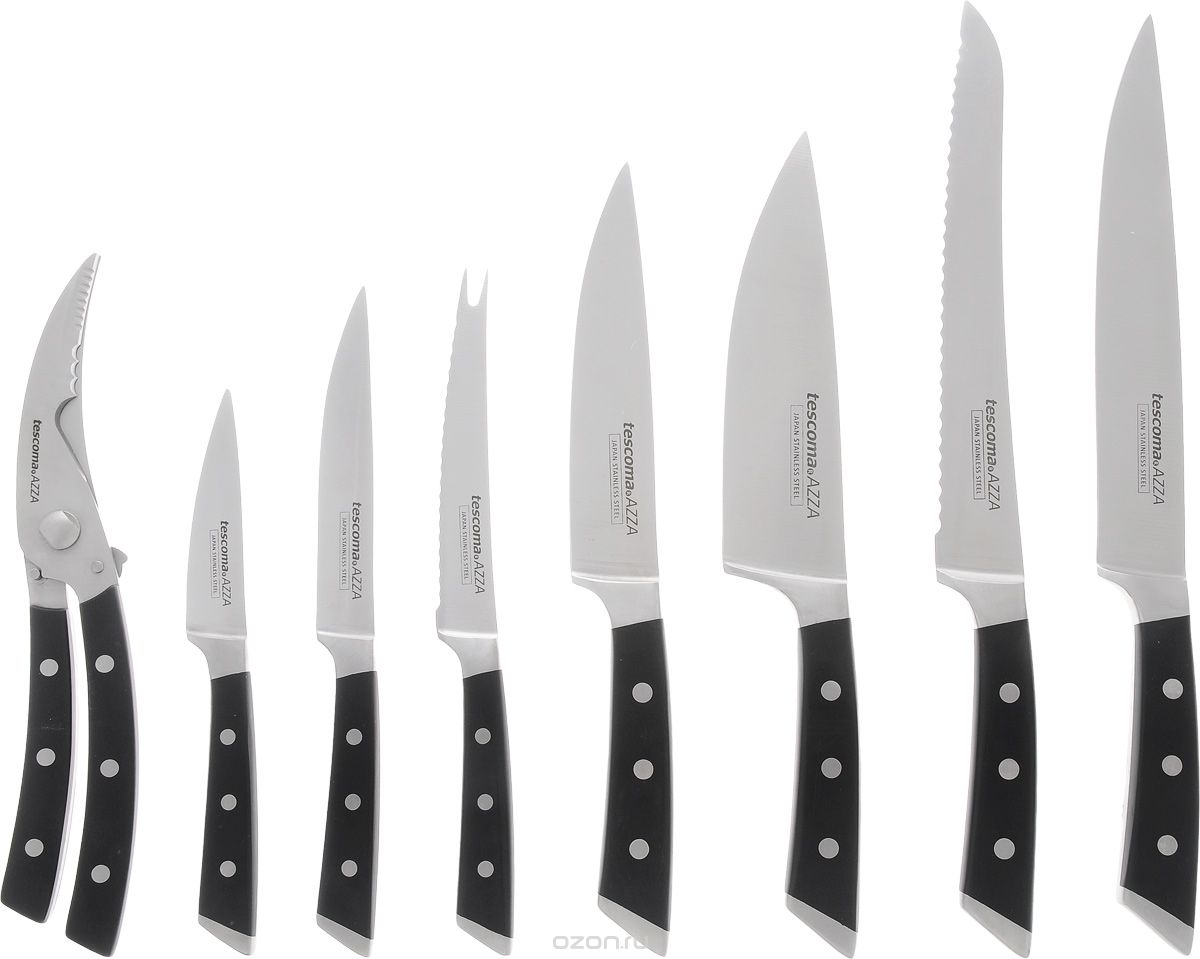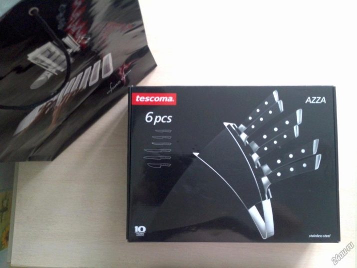 They are in the range of Tescoma very much. They can consist of three or more items, except for knives, a cutting board, a plastic, wooden or metal magnetic stand, scissors for cutting poultry and some other devices can be included in the kit.