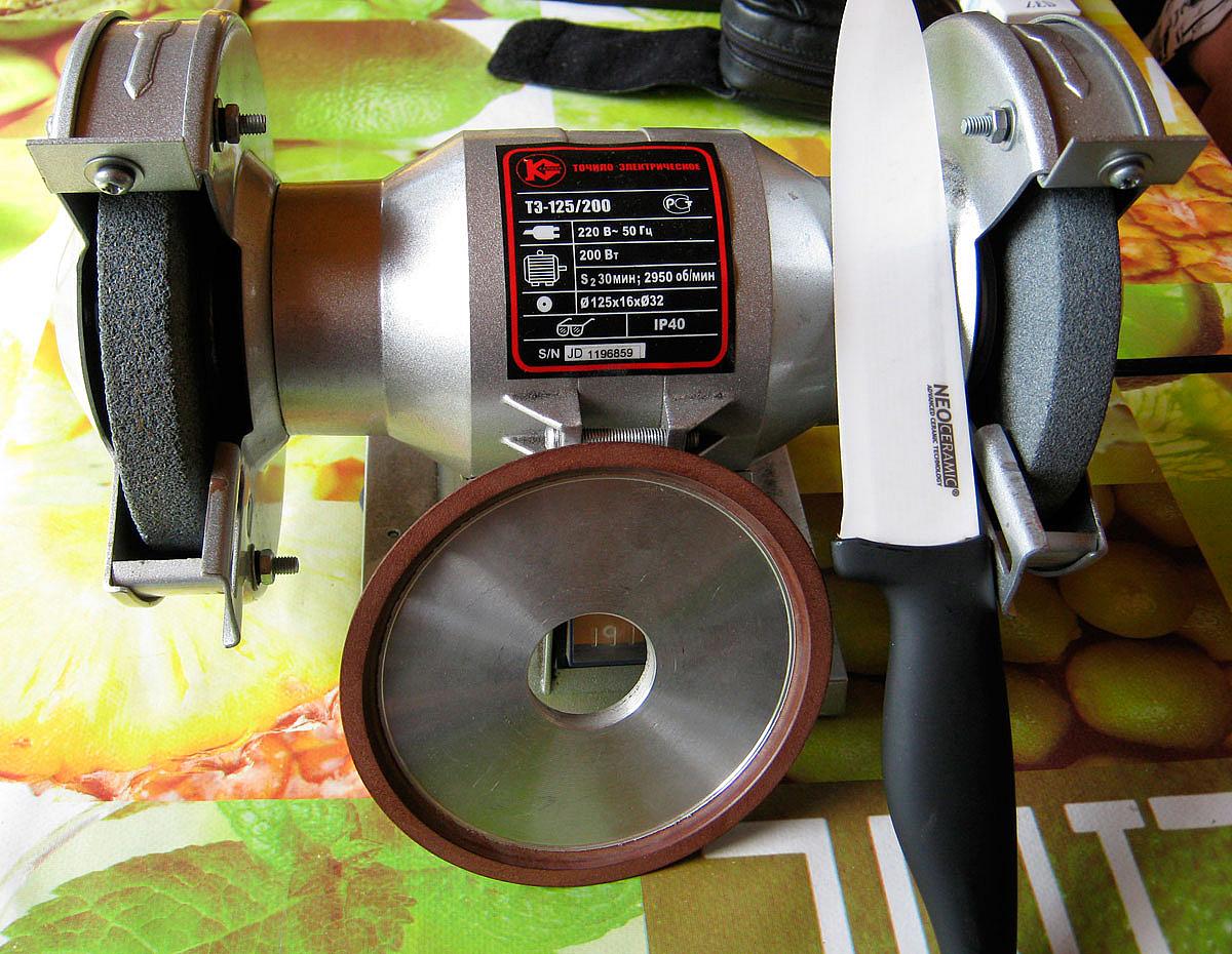 To sharpen the ceramic blade you need at low speeds of the diamond wheel, constantly moving the knife along the grinding wheel with smooth circular movements, gradually reducing the pressure when approaching the blade edge. To sharpen the back side of the blade you need to flip and repeat processing.