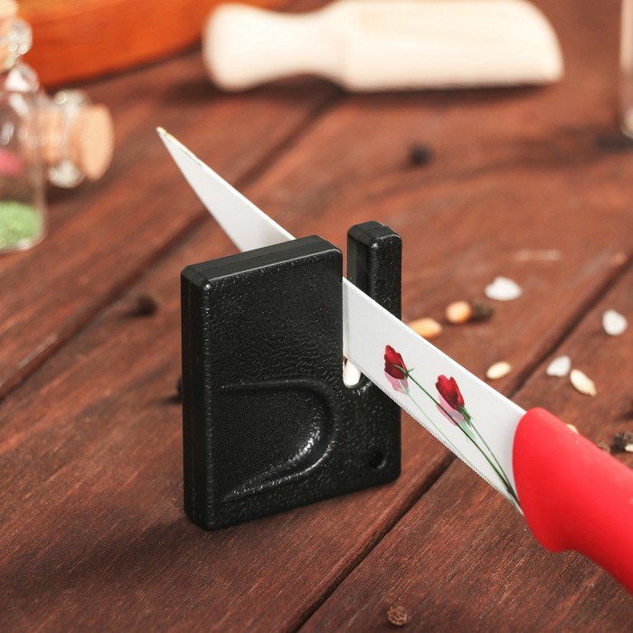 Cheap roller sharpeners with pockets and corundum inserts (made in China) are strictly not recommended for sharpening metal-ceramic knives. The rollers leave deep scratches and chips on the blade surface. After processing a metal-ceramic knife blade that has lost its sharpness with such a “Chinese sharpening”, it most often deteriorates irrevocably, an expensive knife has to be thrown away and bought a new one.