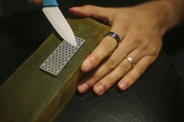 The most time-consuming method is to sharpen a metal-ceramic knife with a diamond paste by hand. To do this, you need to additionally purchase a wide leather belt or a wooden bar made of oak (beech).One end of the belt is securely fastened to the wall or to the surface of the table with a hook or screw. Diamond paste evenly smear on the surface of the leather belt and pull it with his left hand. The knife is taken in the right hand and with a small effort moves the blade back and forth through the belt by slightly pressing it to the surface.
