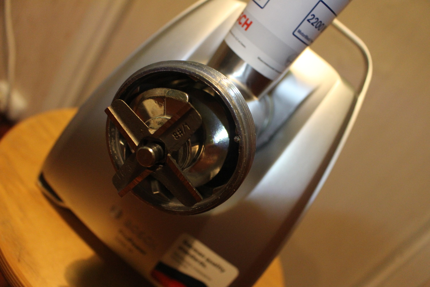- attach the knife and the grill on the thin end of the auger shaft, and on the other side the handle;