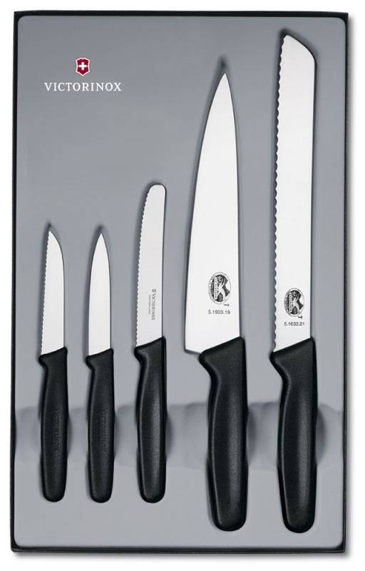Victorinox company produces a huge number of different sets of kitchen knives and accessories. The table below shows some of the characteristics of the individual kits.